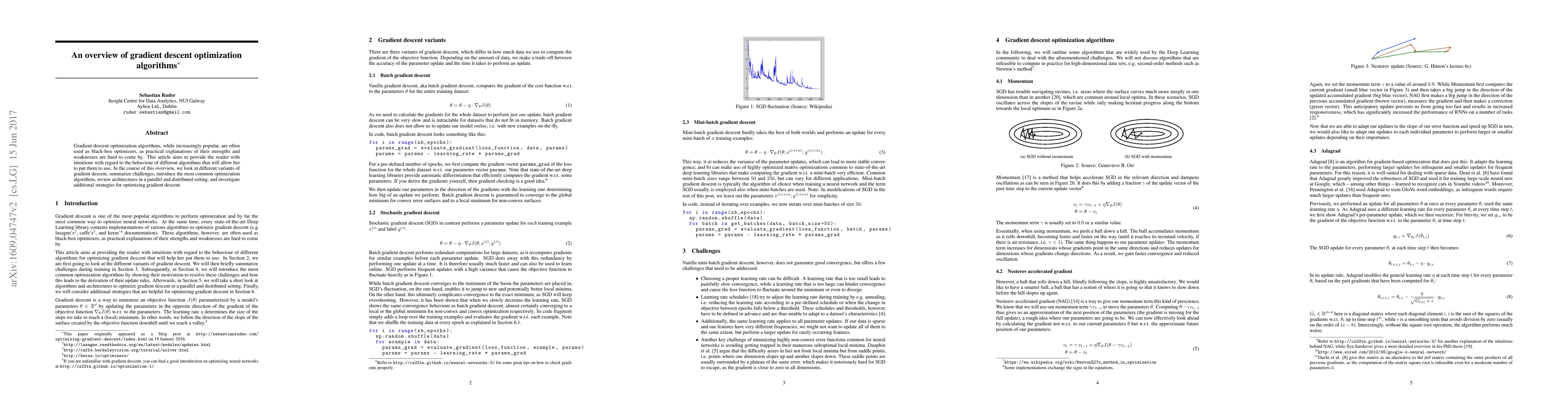 This paper provides an intuitive overview of gradient descent optimization algorithms, examining various variants, challenges, common optimization methods, and strategies for parallel and distributed settings to enhance understanding and practical application.