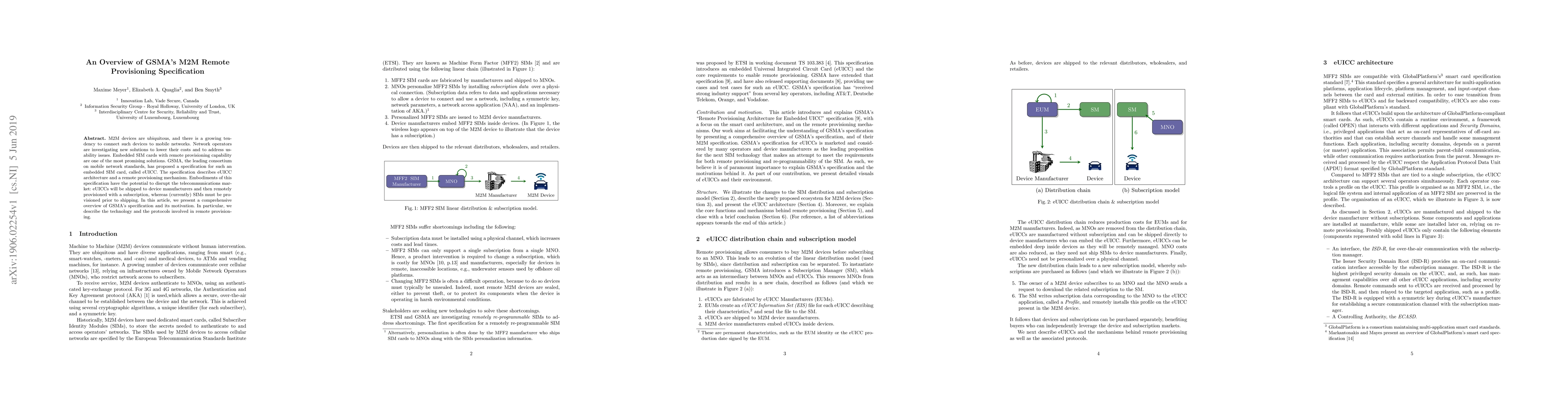 This paper provides a comprehensive overview of GSMA's M2M Remote Provisioning Specification, focusing on the eUICC architecture and its remote provisioning mechanism. The specification aims to lower network operator costs and improve usability by enabling embedded SIM cards to be shipped unprovisioned and activated remotely.