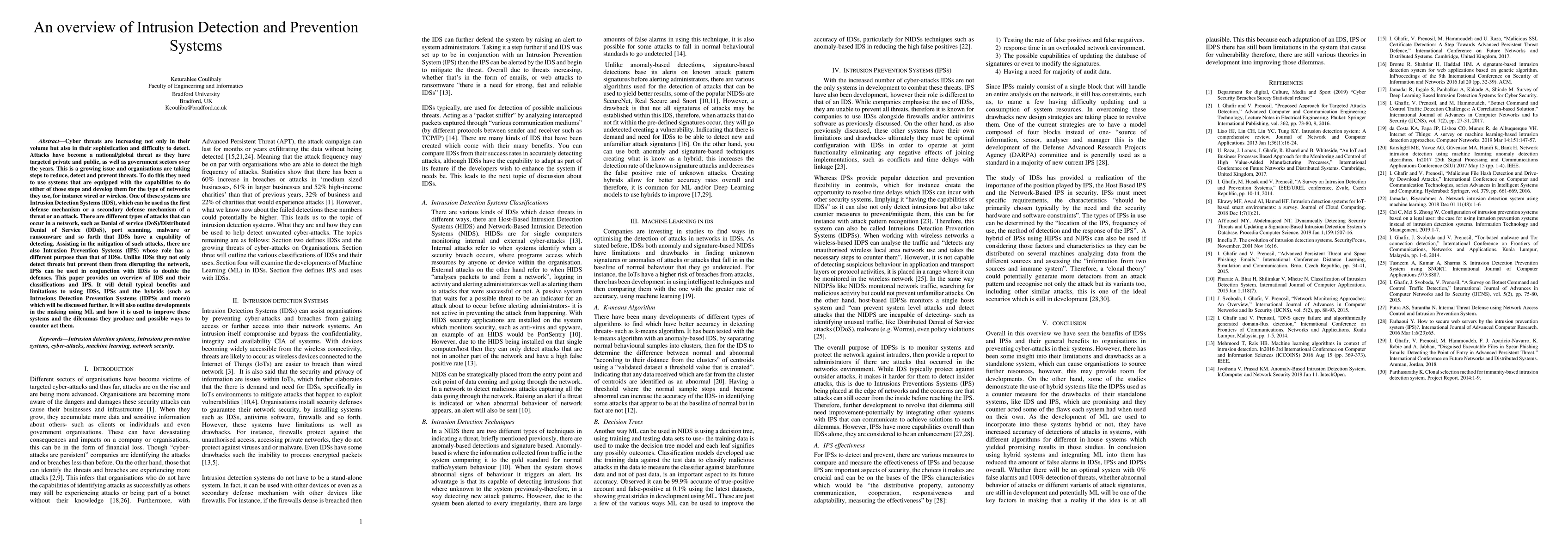 Cyber threats are increasing not only in their volume but also in their sophistication and difficulty to detect. Attacks have become a national/global threat as they have targeted private and public, as well as government sectors over the years. This is a growing issue and organisations are taking steps to reduce, detect and prevent threats. To do this they need to use systems that are equipped with the capabilities to do either of those steps and develop them for the type of networks they use, for instance wired or wireless. One of these systems are Intrusion Detection Systems (IDS), which can be used as the first defence mechanism or a secondary defence mechanism of a threat or an attack. There are different types of attacks that can occur in a network, such as Denial of service (DoS)/Distributed Denial of Service (DDoS), port scanning, malware or ransomware and so forth that IDSs have a capability of detecting. Assisting in the mitigation of such attacks, there are also Intrusion Prevention Systems (IPS) whose role has a different purpose than that of IDSs. Unlike IDSs they not only detect threats but prevent them from disrupting the network, IPSs can be used in conjunction with IDSs to double the defences. This paper provides an overview of IDS and their classifications and IPS. It will detail typical benefits and limitations to using IDSs, IPSs and the hybrids (such as Intrusions Detection Prevention Systems (IDPSs and more)) which will be discussed further. It will also outline developments in the making using ML and how it is used to improve these systems and the dilemmas they produce and possible ways to counter act them.