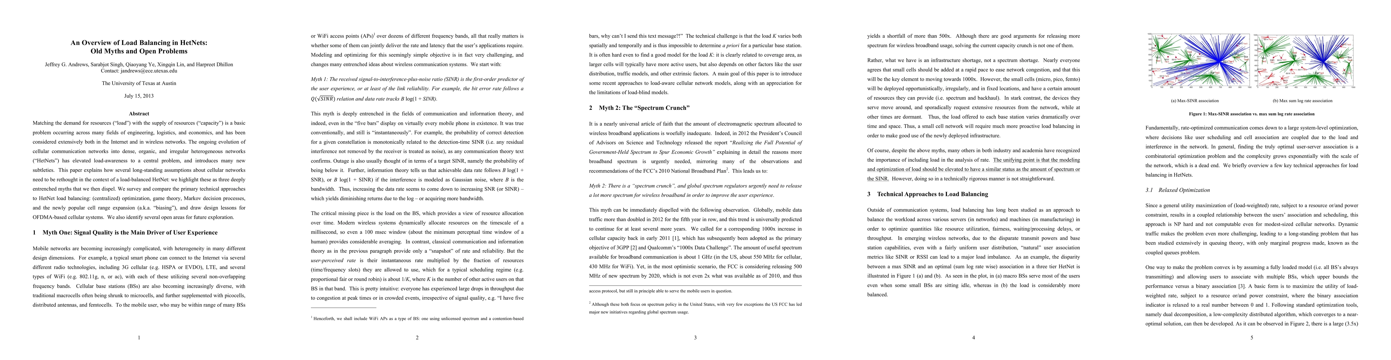 This paper critiques long-standing assumptions about load balancing in heterogeneous networks (HetNets), dispelling three myths and comparing various technical approaches, including optimization, game theory, and cell range expansion. It also highlights open problems and design lessons for OFDMA-based systems.