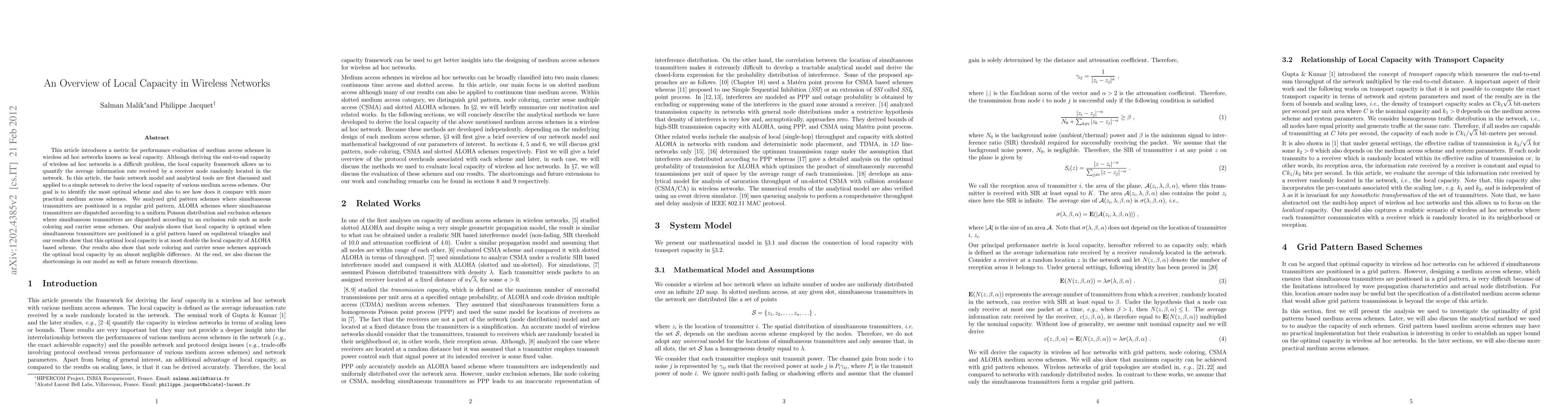This paper introduces the concept of local capacity to evaluate medium access schemes in wireless ad hoc networks, demonstrating that grid pattern schemes achieve optimal local capacity, nearly double that of ALOHA schemes, while node coloring and carrier sense schemes show nearly negligible differences. Future research directions are also proposed.