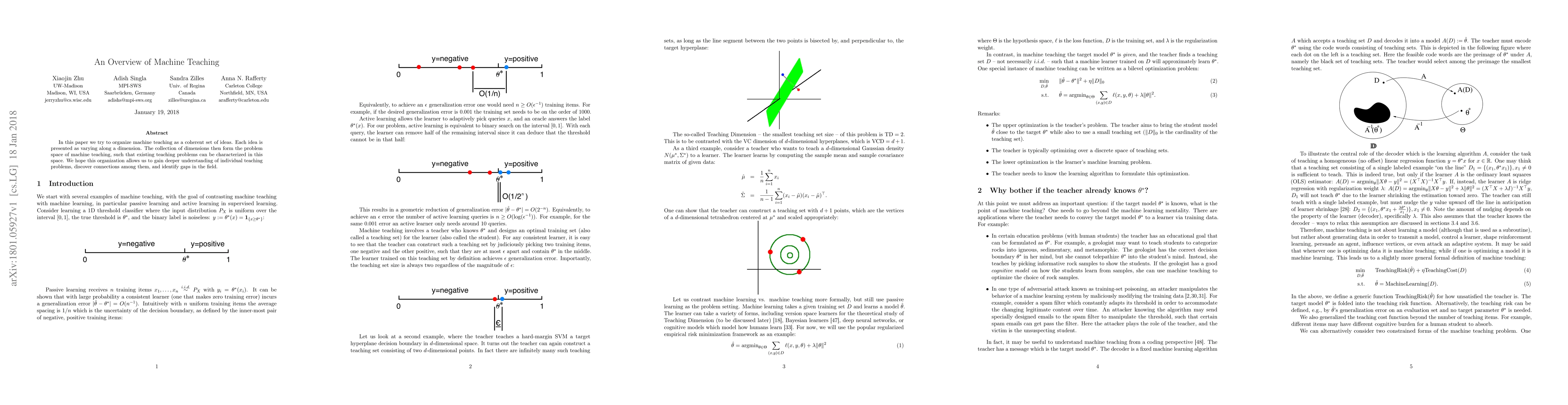 In this paper we try to organize machine teaching as a coherent set of ideas. Each idea is presented as varying along a dimension. The collection of dimensions then form the problem space of machine teaching, such that existing teaching problems can be characterized in this space. We hope this organization allows us to gain deeper understanding of individual teaching problems, discover connections among them, and identify gaps in the field.