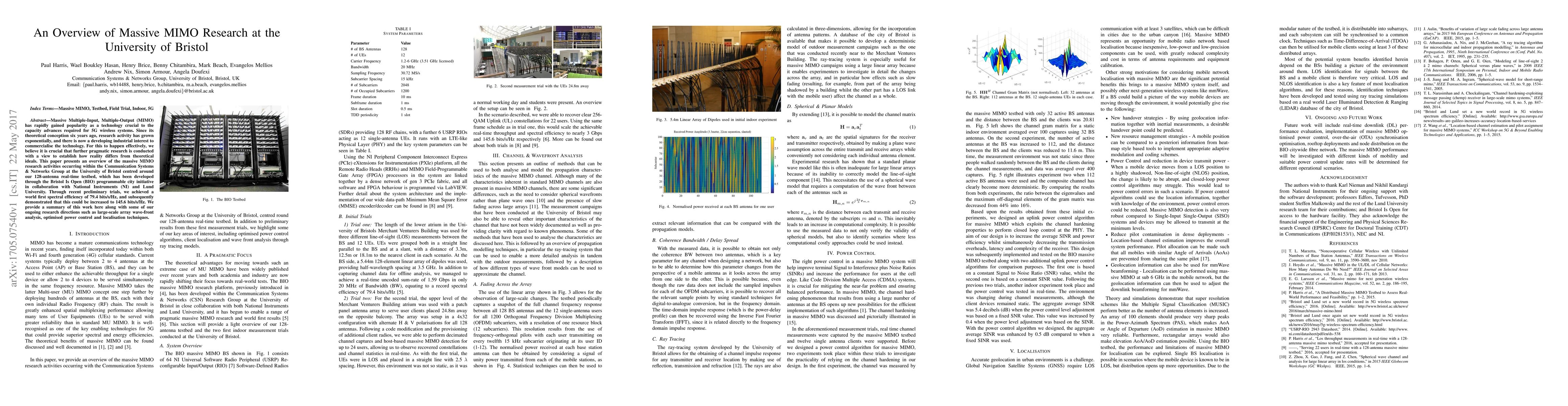 This paper provides an overview of the University of Bristol's massive MIMO research, highlighting their 128-antenna testbed and achieving a world-first spectral efficiency of 79.4 bits/s/Hz, later increased to 145.6 bits/s/Hz, alongside ongoing projects in array wave-front analysis, power control, and localisation techniques.