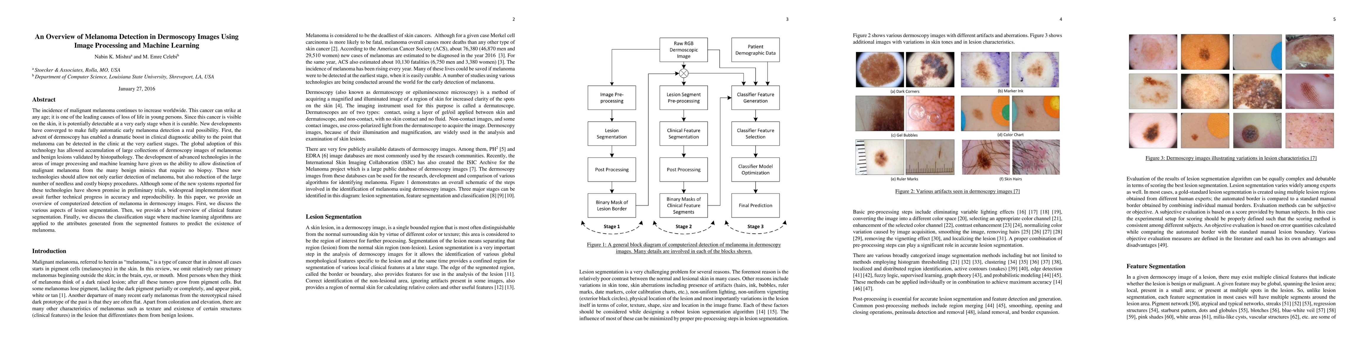 This paper provides an overview of automated melanoma detection in dermoscopy images using image processing and machine learning. It discusses lesion segmentation, clinical feature extraction, and the application of machine learning algorithms for classifying melanoma versus benign lesions, aiming to enhance early detection and reduce unnecessary biopsies.