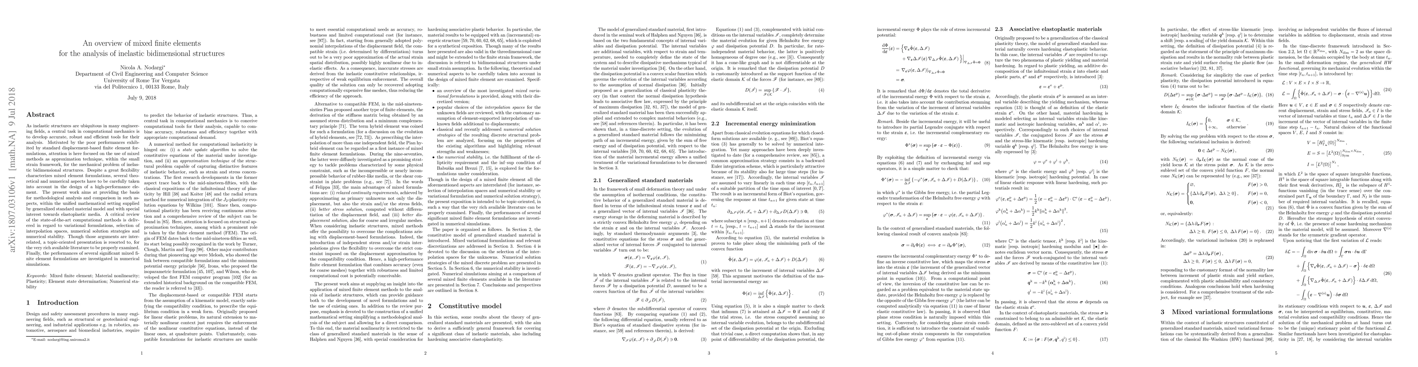 As inelastic structures are ubiquitous in many engineering fields, a central task in computational mechanics is to develop accurate, robust and efficient tools for their analysis. Motivated by the poor performances exhibited by standard displacement-based finite element formulations, attention is here focused on the use of mixed methods as approximation technique, within the small strain framework, for the mechanical problem of inelastic bidimensional structures. Despite a great flexibility characterizes mixed element formulations, several theoretical and numerical aspects have to be carefully taken into account in the design of a high-performance element. The present work aims at providing the basis for methodological analysis and comparison in such aspects, within the unified mathematical setting supplied by generalized standard material model and with special interest towards elastoplastic media. A critical review of the state-of-the-art computational methods is delivered in regard to variational formulations, selection of interpolation spaces, numerical solution strategies and numerical stability. Though those arguments are interrelated, a topic-oriented presentation is resorted to, for the very rich available literature to be properly examined. Finally, the performances of several significant mixed finite element formulations are investigated in numerical simulations.