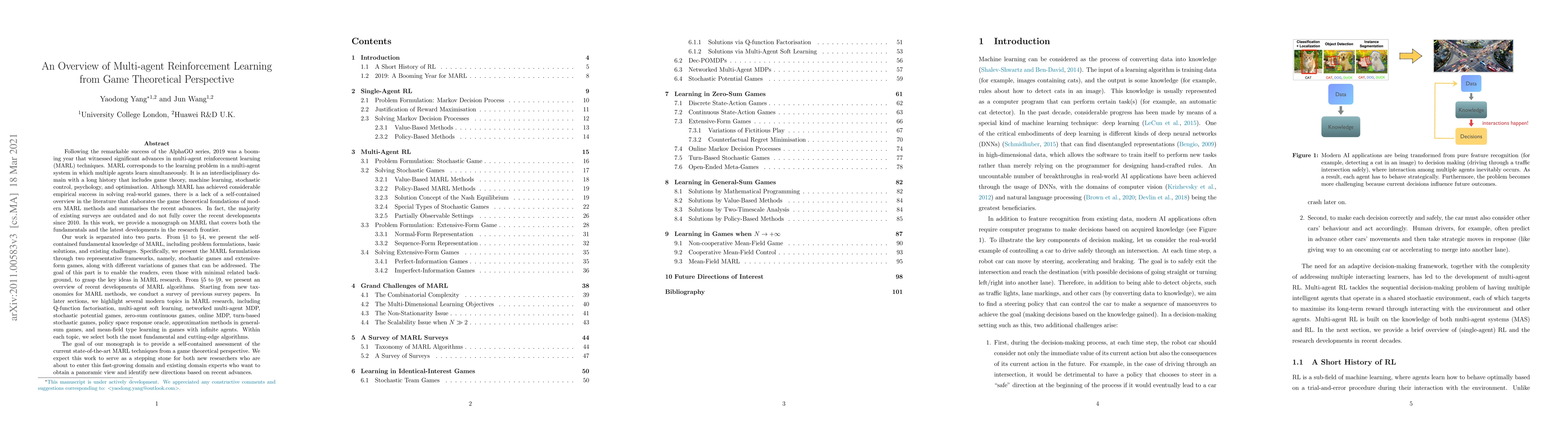 Following the remarkable success of the AlphaGO series, 2019 was a booming year that witnessed significant advances in multi-agent reinforcement learning (MARL) techniques. MARL corresponds to the learning problem in a multi-agent system in which multiple agents learn simultaneously. It is an interdisciplinary domain with a long history that includes game theory, machine learning, stochastic control, psychology, and optimisation. Although MARL has achieved considerable empirical success in solving real-world games, there is a lack of a self-contained overview in the literature that elaborates the game theoretical foundations of modern MARL methods and summarises the recent advances. In fact, the majority of existing surveys are outdated and do not fully cover the recent developments since 2010. In this work, we provide a monograph on MARL that covers both the fundamentals and the latest developments in the research frontier. The goal of our monograph is to provide a self-contained assessment of the current state-of-the-art MARL techniques from a game theoretical perspective. We expect this work to serve as a stepping stone for both new researchers who are about to enter this fast-growing domain and existing domain experts who want to obtain a panoramic view and identify new directions based on recent advances.