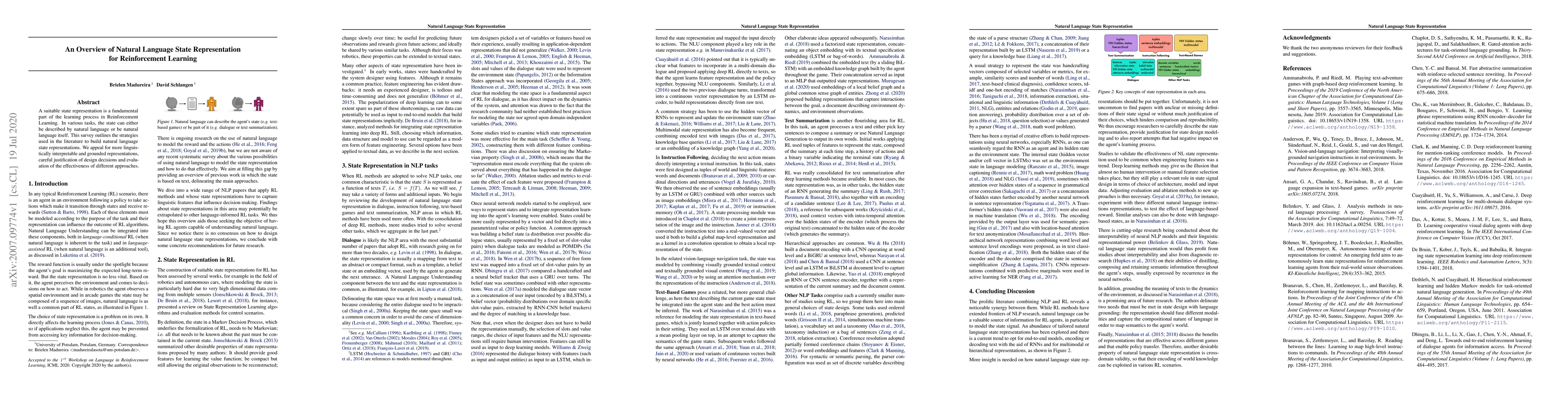 This paper surveys strategies for creating natural language state representations in reinforcement learning, emphasizing the need for linguistically interpretable and grounded models, and calls for thorough justification and evaluation of design choices.