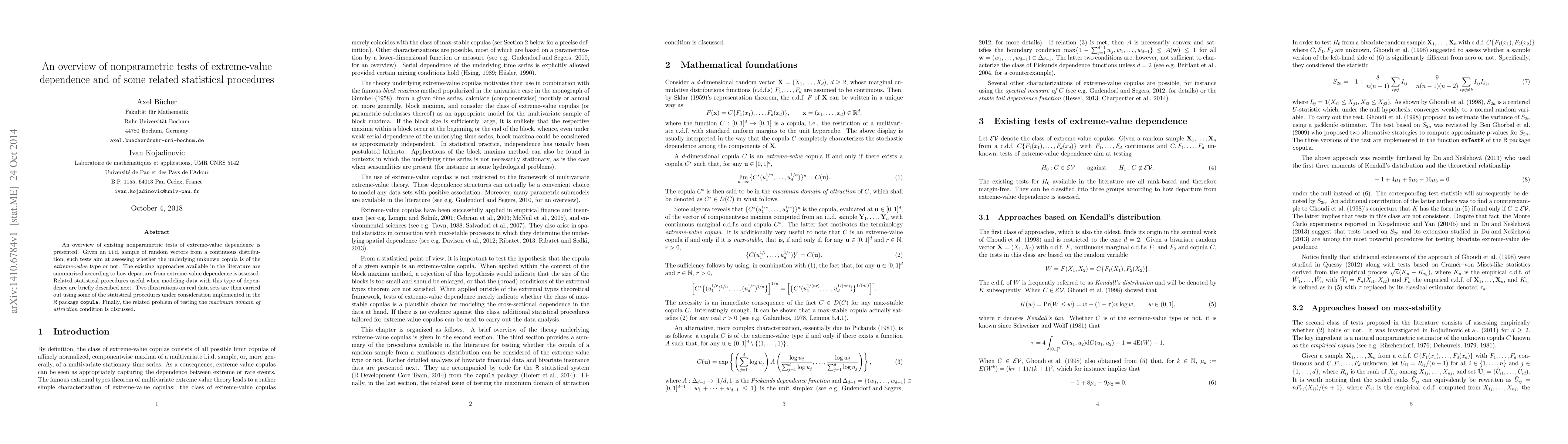 An overview of existing nonparametric tests of extreme-value dependence is presented. Given an i.i.d.\ sample of random vectors from a continuous distribution, such tests aim at assessing whether the underlying unknown copula is of the {\em extreme-value} type or not. The existing approaches available in the literature are summarized according to how departure from extreme-value dependence is assessed. Related statistical procedures useful when modeling data with this type of dependence are briefly described next. Two illustrations on real data sets are then carried out using some of the statistical procedures under consideration implemented in the \textsf{R} package {\tt copula}. Finally, the related problem of testing the {\em maximum domain of attraction} condition is discussed.