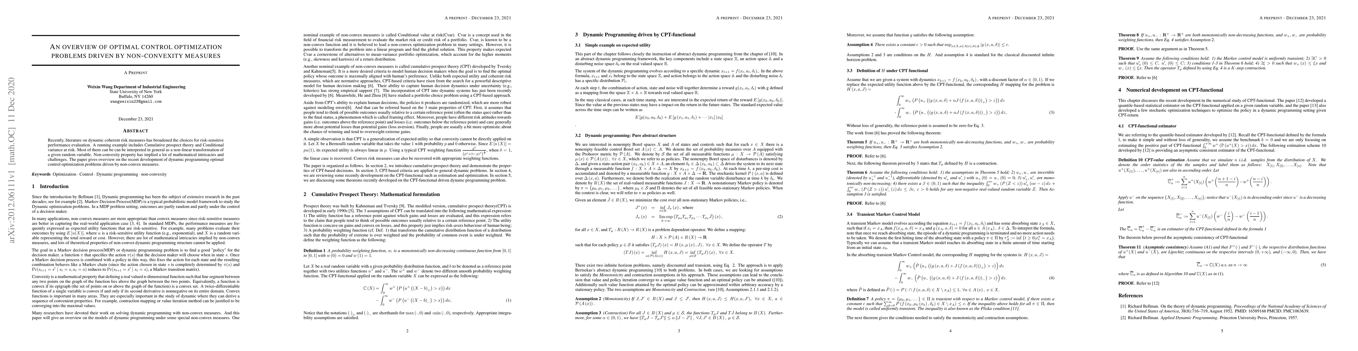 Recently, literature on dynamic coherent risk measures has broadened the choices for risk-sensitive performance evaluation. A running example includes Cumulative prospect theory and Conditional variance at risk. Most of them can be can be interpreted in general as a non-linear transformation of a given random variable. Non-convexity property has implied a lot of mathematical intricacies and challenges. The paper gives overview on the recent development of dynamic programming optimal control optimization problems driven by non-convex measures.