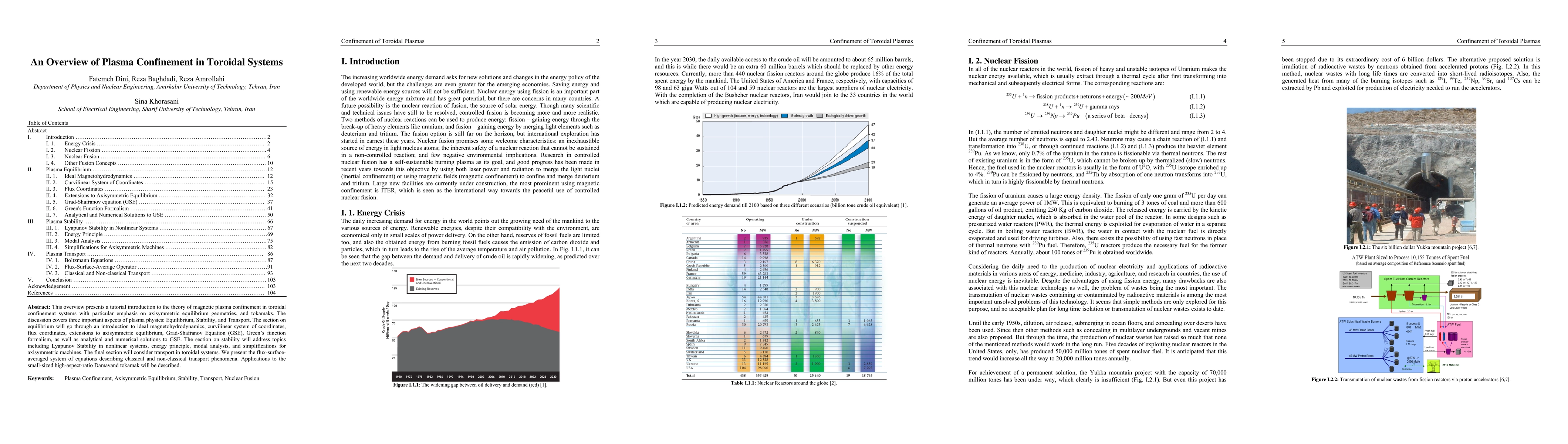 This paper provides an overview of plasma confinement in toroidal systems, covering equilibrium, stability, and transport aspects, with a focus on axisymmetric geometries and the Grad-Shafranov Equation, and applies to the Damavand tokamak.