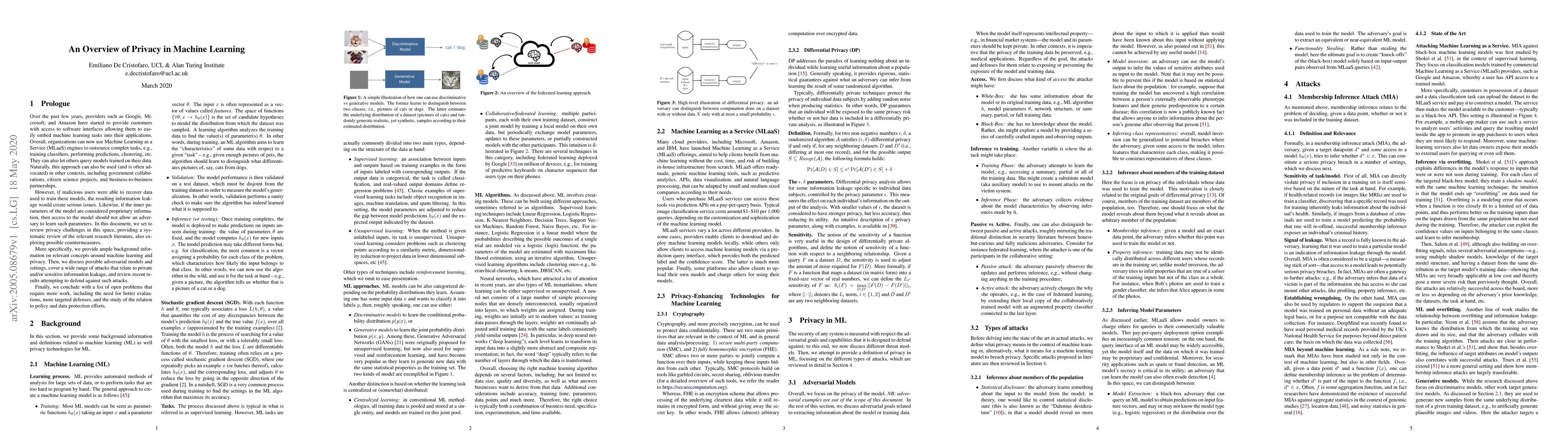This paper reviews privacy challenges in machine learning, focusing on data and model leakage risks when using Machine Learning as a Service. It explores various attacks and defenses, concluding with open issues like better evaluations and policy alignment.