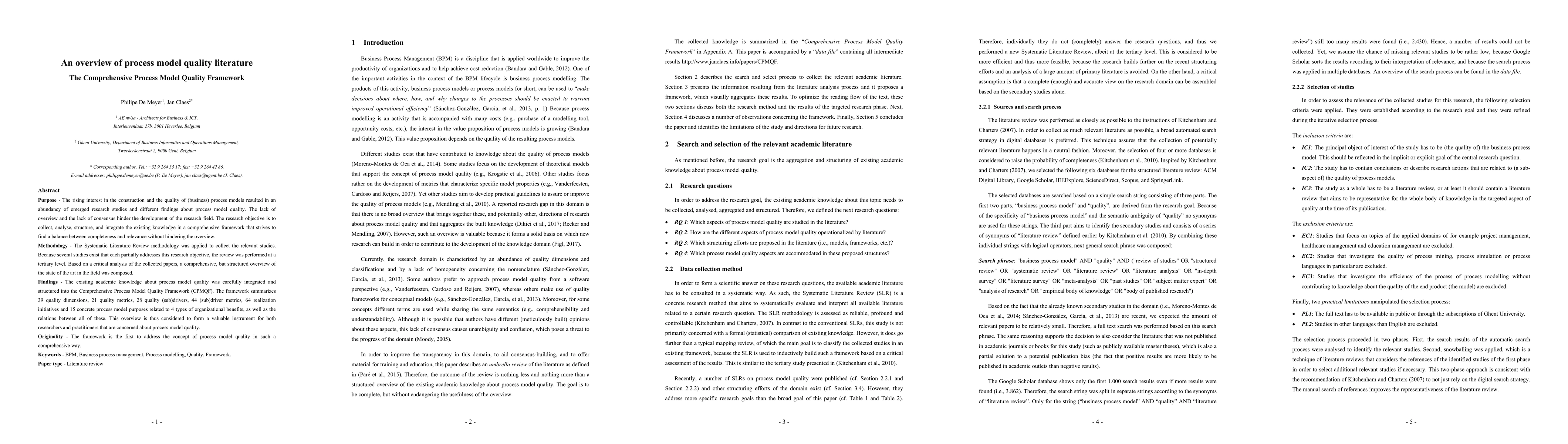 The rising interest in the construction and the quality of (business) process models resulted in an abundancy of emerged research studies and different findings about process model quality. The lack of overview and the lack of consensus hinder the development of the research field. The research objective is to collect, analyse, structure, and integrate the existing knowledge in a comprehensive framework that strives to find a balance between completeness and relevance without hindering the overview. The Systematic Literature Review methodology was applied to collect the relevant studies. Because several studies exist that each partially addresses this research objective, the review was performed at a tertiary level. Based on a critical analysis of the collected papers, a comprehensive, but structured overview of the state of the art in the field was composed. The existing academic knowledge about process model quality was carefully integrated and structured into the Comprehensive Process Model Quality Framework (CPMQF). The framework summarizes 39 quality dimensions, 21 quality metrics, 28 quality (sub)drivers, 44 (sub)driver metrics, 64 realization initiatives and 15 concrete process model purposes related to 4 types of organizational benefits, as well as the relations between all of these. This overview is thus considered to form a valuable instrument for both researchers and practitioners that are concerned about process model quality. The framework is the first to address the concept of process model quality in such a comprehensive way.