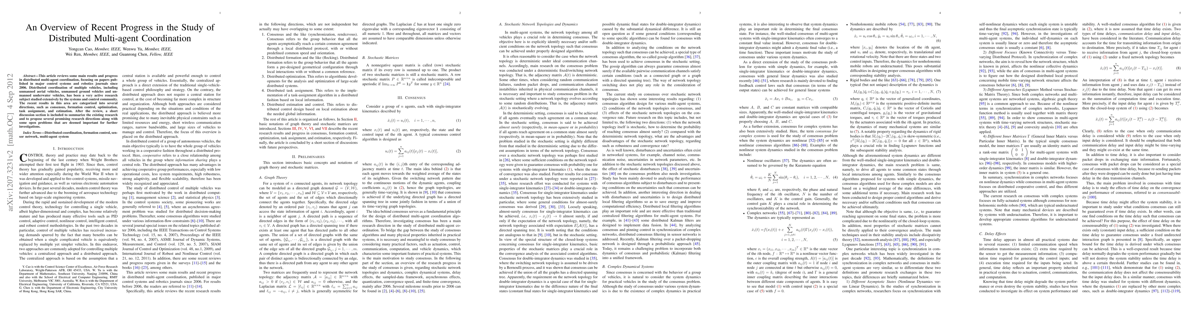 This paper reviews recent advancements in distributed multi-agent coordination, highlighting key results in consensus, formation control, optimization, task assignment, and estimation, particularly in the context of unmanned vehicles. It concludes with a discussion on promising future research directions and significant open problems.