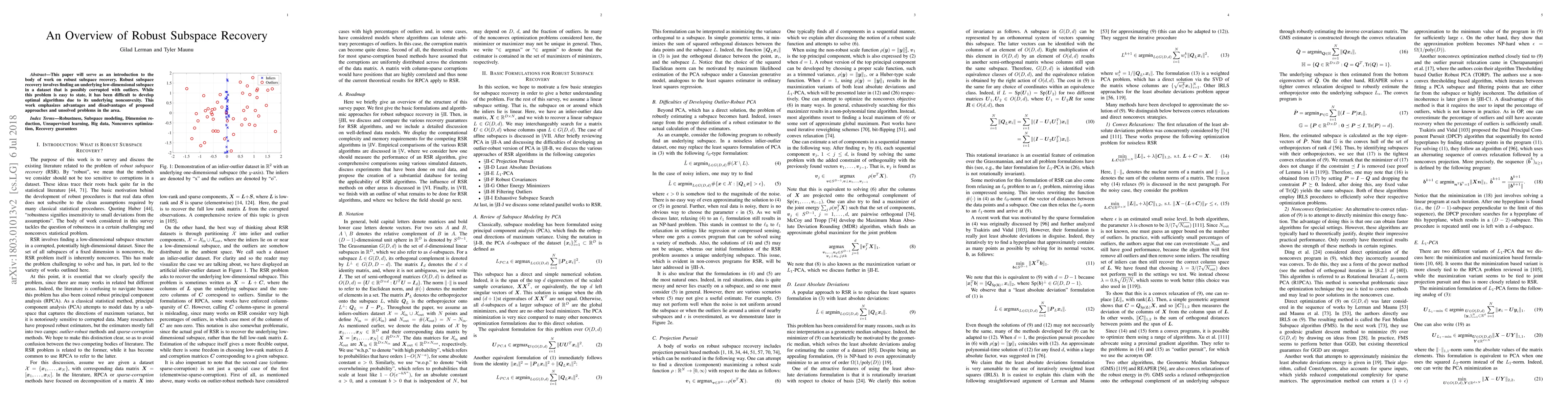 This paper provides an overview of robust subspace recovery, focusing on methods for identifying low-dimensional subspaces in datasets with outliers, and discusses the challenges and current state of the field. It highlights both the strengths and weaknesses of existing algorithms and identifies areas needing further research.