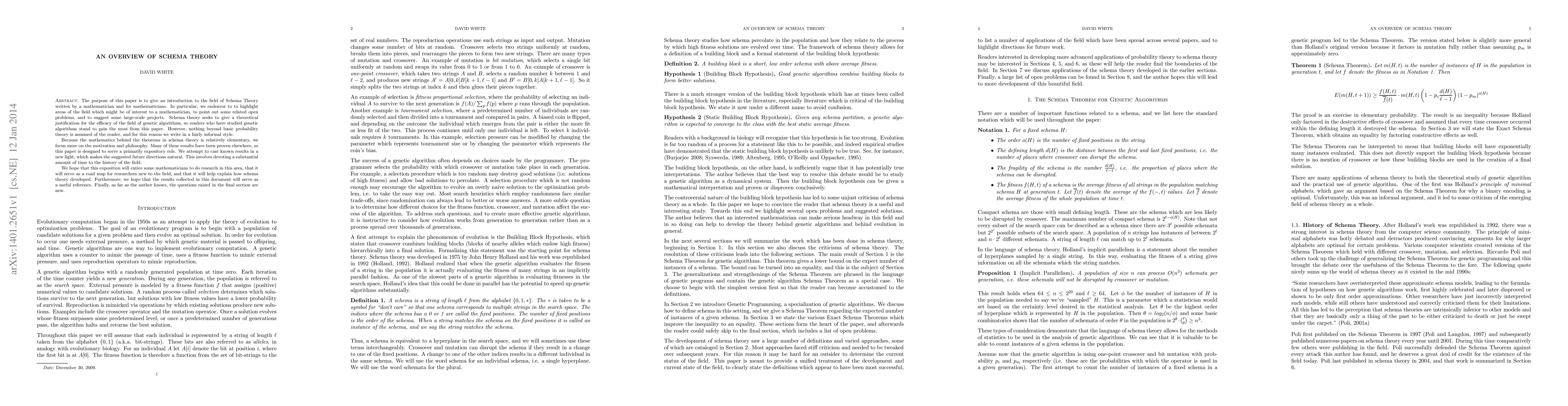 This paper provides an accessible introduction to Schema Theory for mathematicians, focusing on its motivation and historical development. It aims to highlight its relevance to genetic algorithms and suggest future research directions, while serving as a reference for new researchers.