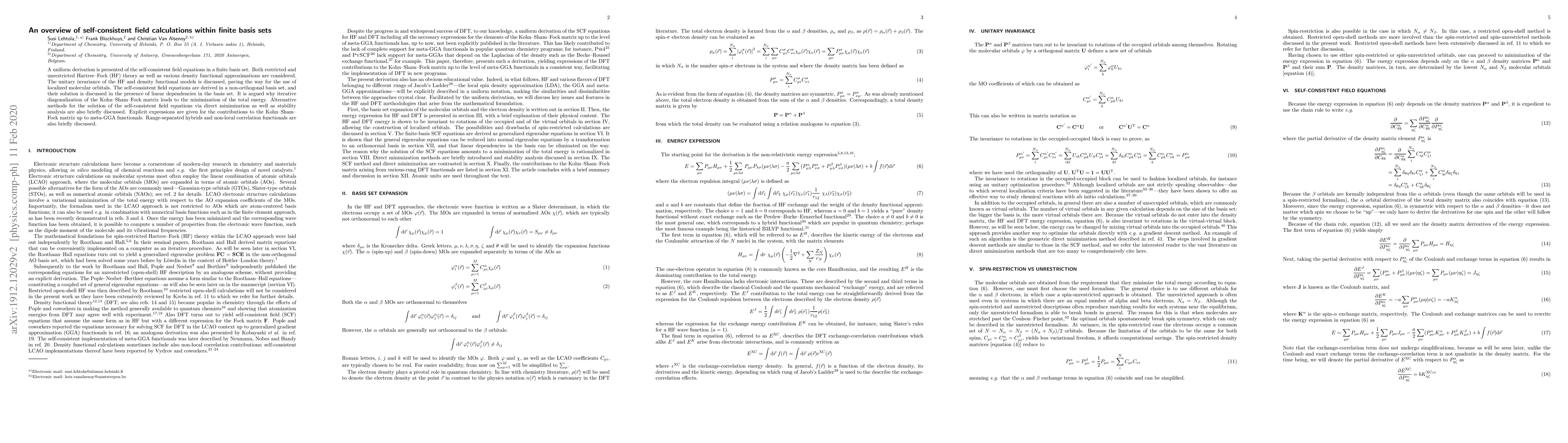 A uniform derivation is presented of the self-consistent field equations in a finite basis set. Both restricted and unrestricted Hartree-Fock (HF) theory as well as various density functional (DF) approximations are considered. The unitary invariance of the HF and DF models is discussed, paving the way for the use of localized molecular orbitals. The self-consistent field equations are derived in a non-orthogonal basis set, and their solution is discussed in the presence of linear dependencies in the basis set. It is argued why iterative diagonalization of the Kohn-Sham-Fock matrix leads to the minimization of the total energy. Alternative methods for the solution of the self-consistent field equations via direct minimization as well as stability analysis are also briefly discussed. Explicit expressions are given for the contributions to the Kohn-Sham-Fock matrix up to meta-GGA functionals. Range-separated hybrids and non-local correlation functionals are also briefly discussed.