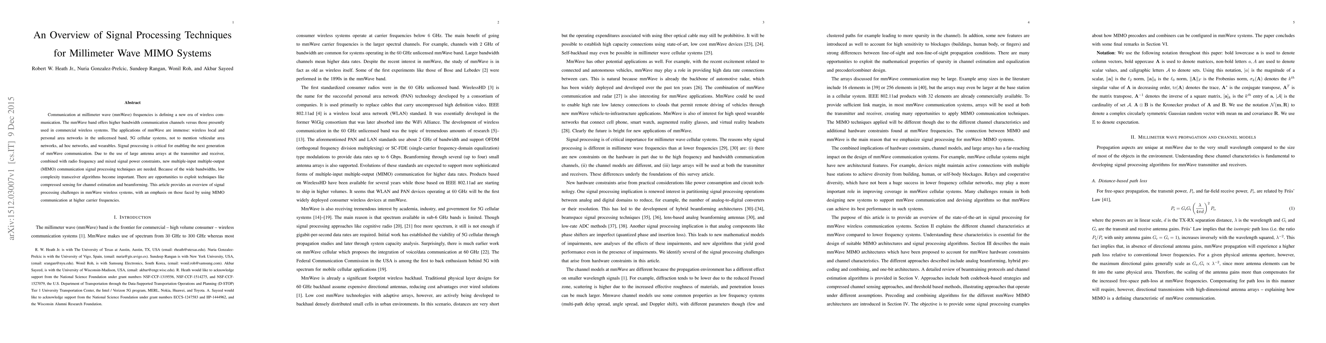 Communication at millimeter wave (mmWave) frequencies is defining a new era of wireless communication. The mmWave band offers higher bandwidth communication channels versus those presently used in commercial wireless systems. The applications of mmWave are immense: wireless local and personal area networks in the unlicensed band, 5G cellular systems, not to mention vehicular area networks, ad hoc networks, and wearables. Signal processing is critical for enabling the next generation of mmWave communication. Due to the use of large antenna arrays at the transmitter and receiver, combined with radio frequency and mixed signal power constraints, new multiple-input multiple-output (MIMO) communication signal processing techniques are needed. Because of the wide bandwidths, low complexity transceiver algorithms become important. There are opportunities to exploit techniques like compressed sensing for channel estimation and beamforming. This article provides an overview of signal processing challenges in mmWave wireless systems, with an emphasis on those faced by using MIMO communication at higher carrier frequencies.