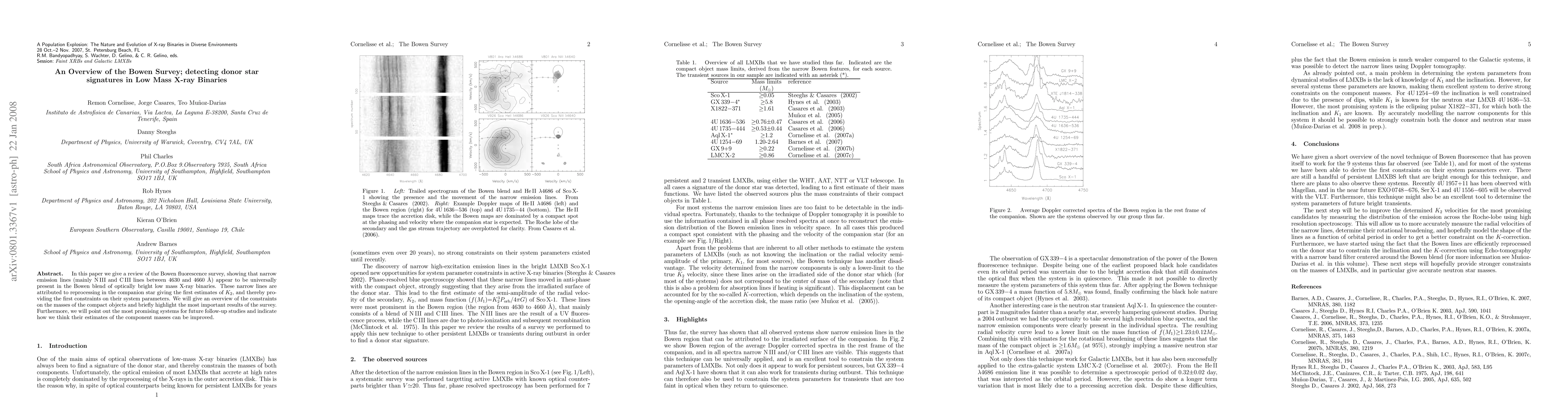 In this paper we give a review of the Bowen fluorescence survey, showing that narrow emission lines (mainly NIII and CIII lines between 4630 and 4660 A) appear to be universally present in the Bowen blend of optically bright low mass X-ray binaries. These narrow lines are attributed to reprocessing in the companion star giving the first estimates of K_2, and thereby providing the first constraints on their system parameters. We will give an overview of the constraints on the masses of the compact objects and briefly highlight the most important results of the survey. Furthermore, we will point out the most promising systems for future follow-up studies and indicate how we think their estimates of the component masses can be improved.