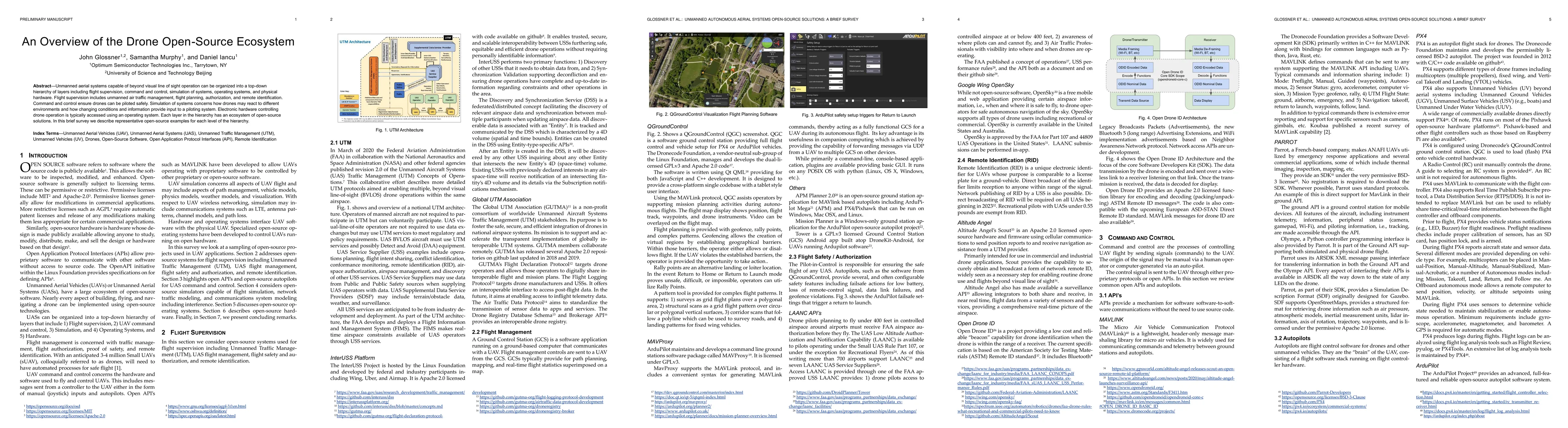 This paper provides an overview of the open-source ecosystem for unmanned aerial systems, detailing representative open-source solutions for each layer from flight supervision to physical hardware, including command and control, simulation, and operating systems. The survey highlights the collaborative nature of drone development within the open-source community.