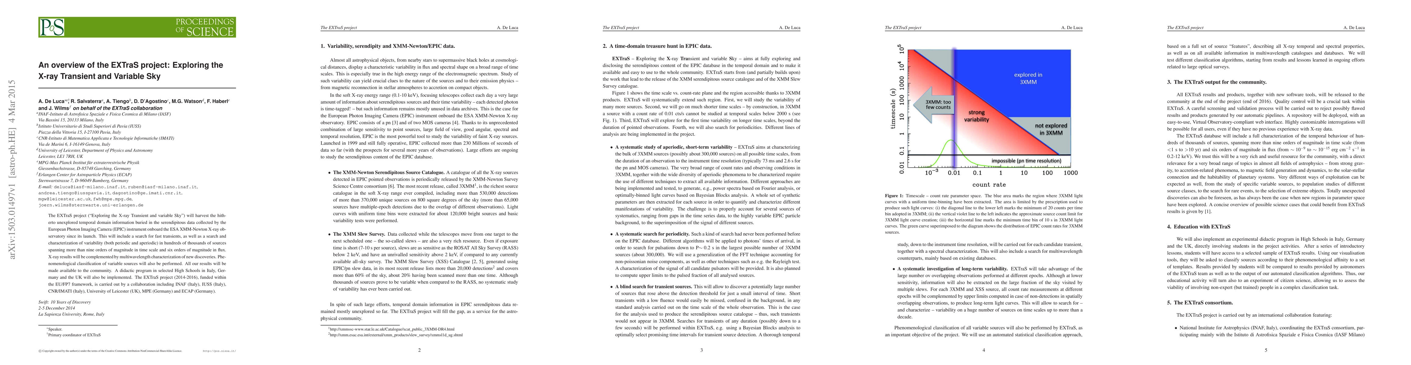 The EXTraS project (Exploring the X-ray Transient and variable Sky) will harvest the hitherto unexplored temporal domain information buried in the serendipitous data collected by the European Photon Imaging Camera (EPIC) instrument onboard the ESA XMM-Newton X-ray observatory since its launch. This will include a search for fast transients, as well as a search and characterization of variability (both periodic and aperiodic) in hundreds of thousands of sources spanning more than nine orders of magnitude in time scale and six orders of magnitude in flux. X-ray results will be complemented by multiwavelength characterization of new discoveries. Phenomenological classification of variable sources will also be performed. All our results will be made available to the community. A didactic program in selected High Schools in Italy, Germany and the UK will also be implemented. The EXTraS project (2014-2016), funded within the EU/FP7 framework, is carried out by a collaboration including INAF (Italy), IUSS (Italy), CNR/IMATI (Italy), University of Leicester (UK), MPE (Germany) and ECAP (Germany).