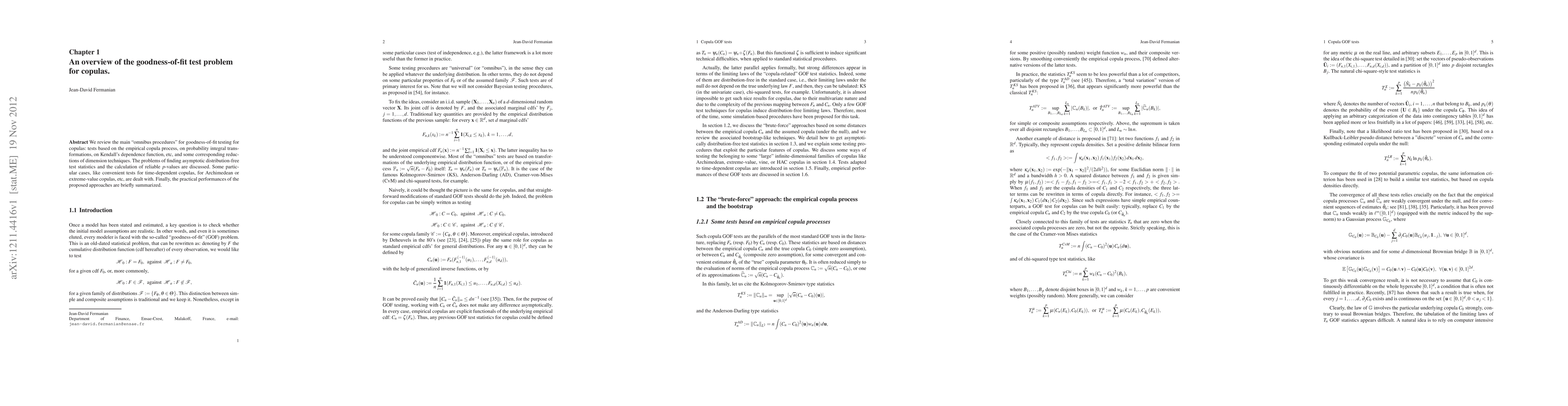 This paper reviews various omnibus procedures for goodness-of-fit testing of copulas, including empirical copula processes, probability integral transformations, and Kendall's dependence function, while addressing the challenges of finding distribution-free test statistics and calculating reliable p-values. It also covers specialized tests for specific copulas and summarizes their practical performance.