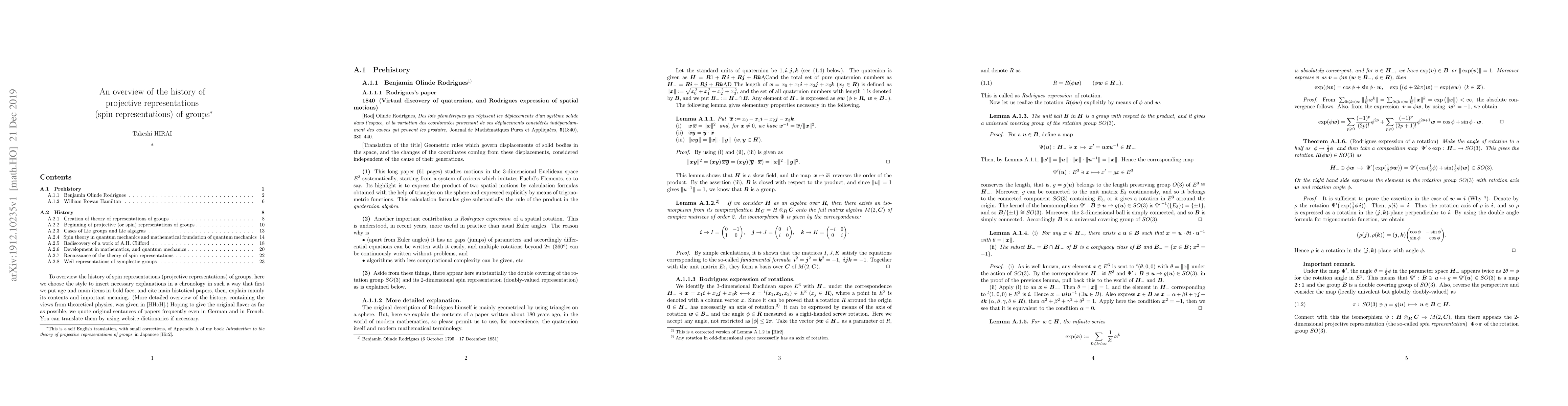 This paper provides an overview of the historical development of projective representations, also known as spin representations, of groups, tracing back to the foundational work on quaternions by Rodrigues and Hamilton. It covers contributions from mathematicians like Schur and physicists such as Pauli and Dirac, culminating in a self-translation from the author's Japanese book.