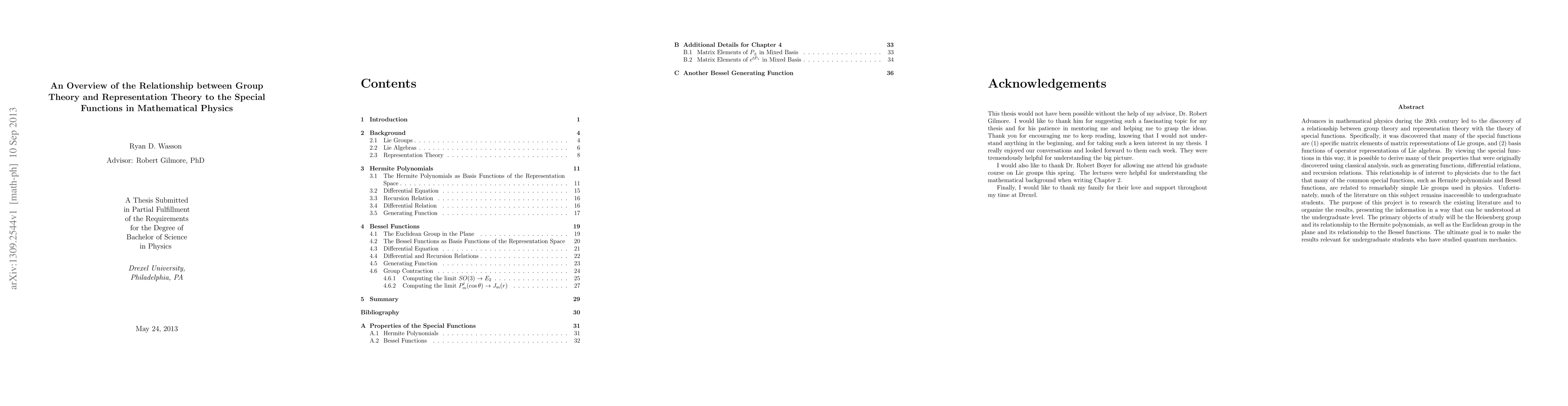 Advances in mathematical physics during the 20th century led to the discovery of a relationship between group theory and representation theory with the theory of special functions. Specifically, it was discovered that many of the special functions are (1) specific matrix elements of matrix representations of Lie groups, and (2) basis functions of operator representations of Lie algebras. By viewing the special functions in this way, it is possible to derive many of their properties that were originally discovered using classical analysis, such as generating functions, differential relations, and recursion relations. This relationship is of interest to physicists due to the fact that many of the common special functions, such as Hermite polynomials and Bessel functions, are related to remarkably simple Lie groups used in physics. Unfortunately, much of the literature on this subject remains inaccessible to undergraduate students. The purpose of this project is to research the existing literature and to organize the results, presenting the information in a way that can be understood at the undergraduate level. The primary objects of study will be the Heisenberg group and its relationship to the Hermite polynomials, as well as the Euclidean group in the plane and its relationship to the Bessel functions. The ultimate goal is to make the results relevant for undergraduate students who have studied quantum mechanics.