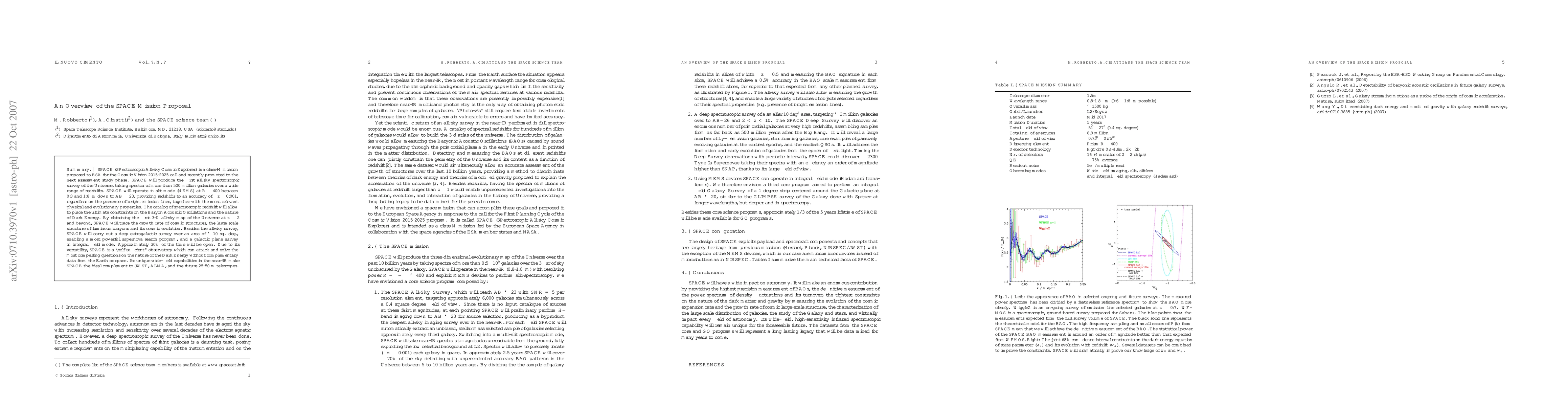SPACE (SPectroscopic All-sky Cosmic Explorer) is a class-M mission proposed to ESA for the Cosmic Vision 2015-2025 call and recently promoted to the next assessment study phase. SPACE will produce the first all-sky spectroscopic survey of the Universe, taking spectra of more than 500 million galaxies over a wide range of redshifts. SPACE will operate in slit mode (MEMS) at R~400 between 0.8 and 1.8micron down to AB~23, providing redshifts to an accuracy of Delta z~0.001, regardless on the presence of bright emission lines, together with the most relevant physical and evolutionary properties. The catalog of spectroscopic redshift will allow to place the ultimate constraints on the Baryon Acoustic Oscillations and the nature of Dark Energy. By obtaining the first 3-D all-sky map of the Universe at z~2 and beyond, SPACE will trace the growth rate of cosmic structures, the large scale structure of luminous baryons and its cosmic evolution. Besides the all-sky survey, SPACE will carry out a deep extragalactic survey over an area of ~10 sq. deg., enabling a most powerful supernova search program, and a galactic plane survey in integral field mode. Approximately 30% of the time will be open. Due to its versatility, SPACE is a ``self-sufficient'' observatory which can attack and solve the most compelling questions on the nature of the Dark Energy without complementary data from the Earth or space. Its unique wide-field capabilities in the near-IR make SPACE the ideal complement to JWST, ALMA, and the future 25-50 m telescopes.