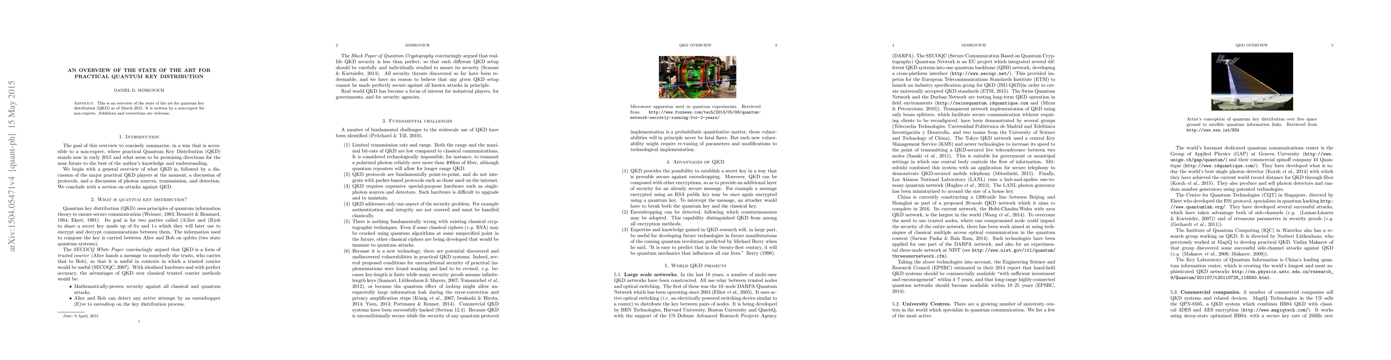 This is an overview of the state of the art for practical quantum key distribution (QKD) as of March 2015. It is written by a non-expert for non-experts. Additions and corrections are welcome.