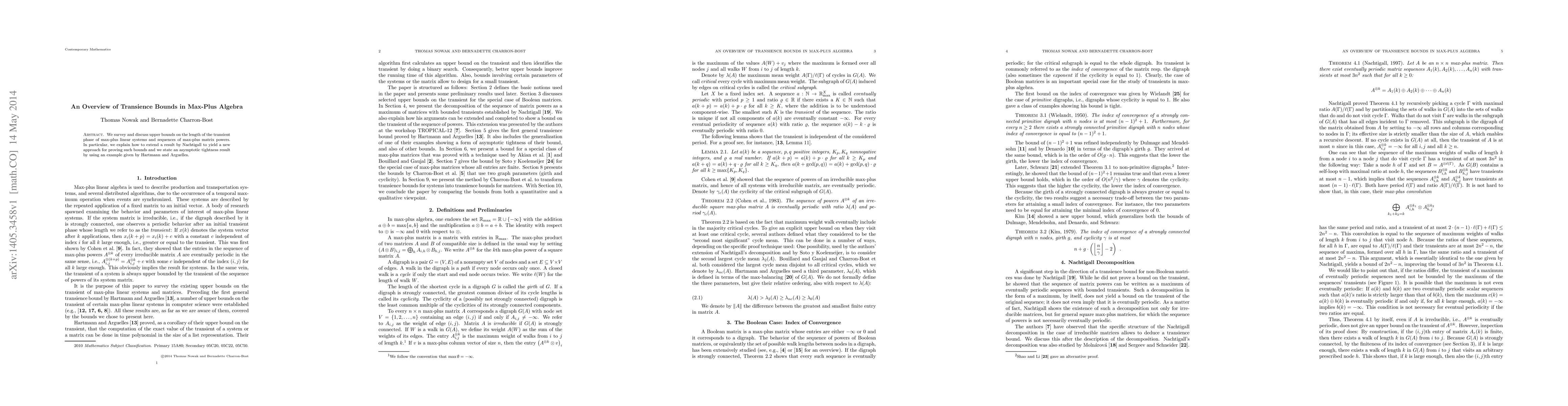The paper provides an overview of transience bounds in max-plus algebra, discussing upper bounds on the length of the transient phase of max-plus linear systems and sequences of max-plus matrix powers. It extends Nachtigall's result and presents an asymptotic tightness example by Hartmann and Arguelles.