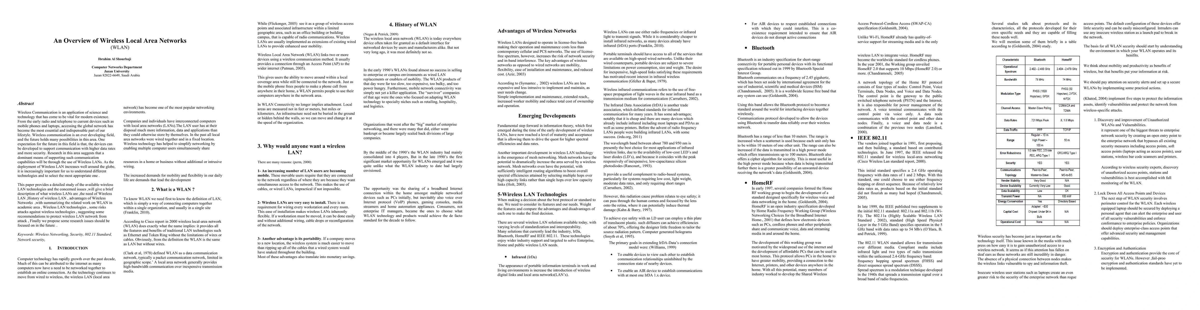 Wireless Communication is an application of science and technology that has come to be vital for modern existence. From the early radio and telephone to current devices such as mobile phones and laptops, accessing the global network has become the most essential and indispensable part of our lifestyle. Wireless communication is an ever developing field, and the future holds many possibilities in this area. One expectation for the future in this field is that, the devices can be developed to support communication with higher data rates and more security. Research in this area suggests that a dominant means of supporting such communication capabilities will be through the use of Wireless LANs. As the deployment of Wireless LAN increases well around the globe, it is increasingly important for us to understand different technologies and to select the most appropriate one. This paper provides a detailed study of the available wireless LAN technologies and the concerned issues, will give a brief description of what wireless LANs are, the need of Wireless LAN, History of wireless LAN, advantages of Wireless Networks, with summarizing the related work on WLAN in academic area, Wireless LAN technologies, some risks attacks against wireless technologies, suggesting some recommendations to protect wireless LAN network from attack, Finally we propose some research issues should be focused on in the future.
