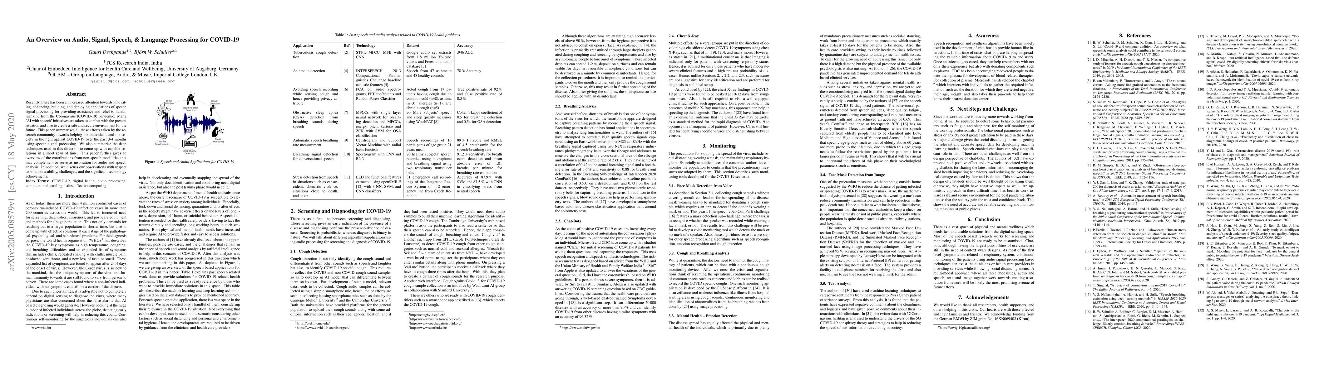 Recently, there has been an increased attention towards innovating, enhancing, building, and deploying applications of speech signal processing for providing assistance and relief to human mankind from the Coronavirus (COVID-19) pandemic. Many AI with speech initiatives are taken to combat with the present situation and also to create a safe and secure environment for the future. This paper summarises all these efforts taken by the re-search community towards helping the individuals and the society in the fight against COVID-19 over the past 3-4 months using speech signal processing. We also summarise the deep techniques used in this direction to come up with capable solutions in a short span of time. This paper further gives an overview of the contributions from non-speech modalities that may complement or serve as inspiration for audio and speech analysis. In addition, we discuss our observations with respect to solution usability, challenges, and the significant technology achievements.