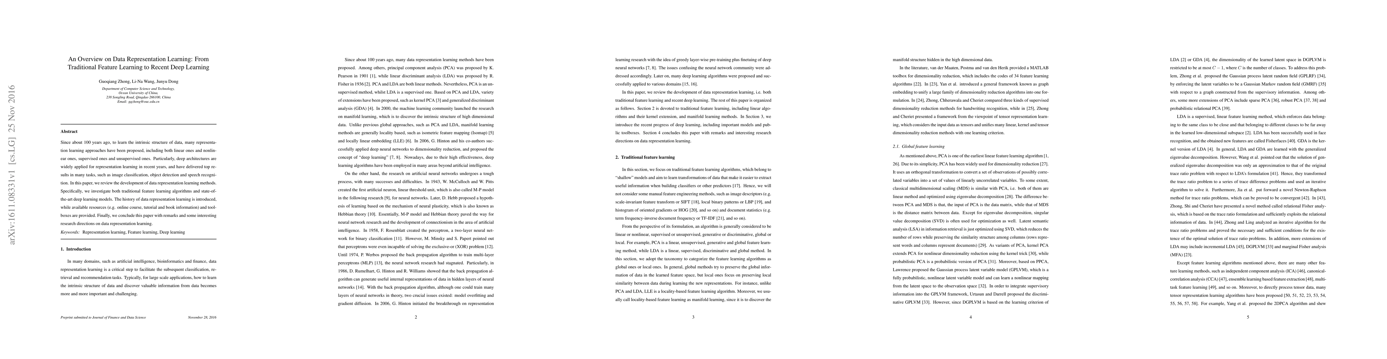 Since about 100 years ago, to learn the intrinsic structure of data, many representation learning approaches have been proposed, including both linear ones and nonlinear ones, supervised ones and unsupervised ones. Particularly, deep architectures are widely applied for representation learning in recent years, and have delivered top results in many tasks, such as image classification, object detection and speech recognition. In this paper, we review the development of data representation learning methods. Specifically, we investigate both traditional feature learning algorithms and state-of-the-art deep learning models. The history of data representation learning is introduced, while available resources (e.g. online course, tutorial and book information) and toolboxes are provided. Finally, we conclude this paper with remarks and some interesting research directions on data representation learning.