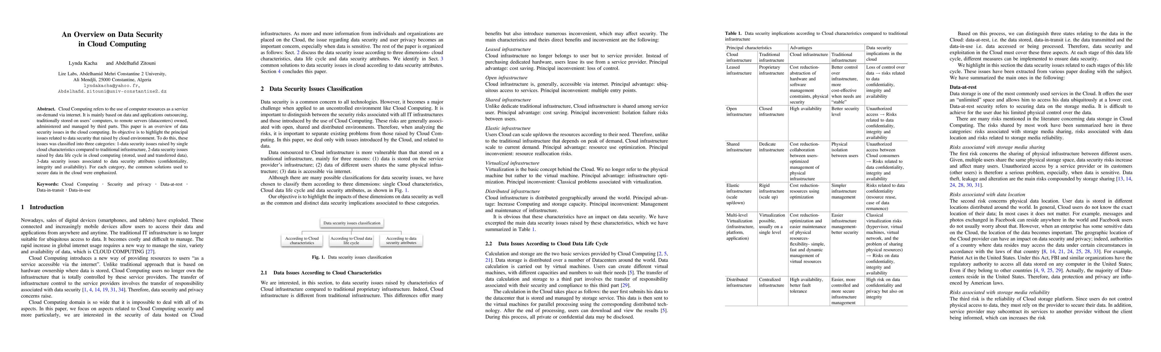 This paper provides an overview of data security issues in cloud computing, categorizing them into three main areas: cloud-specific characteristics, data lifecycle stages, and security attributes. It highlights common solutions for securing data in each category.