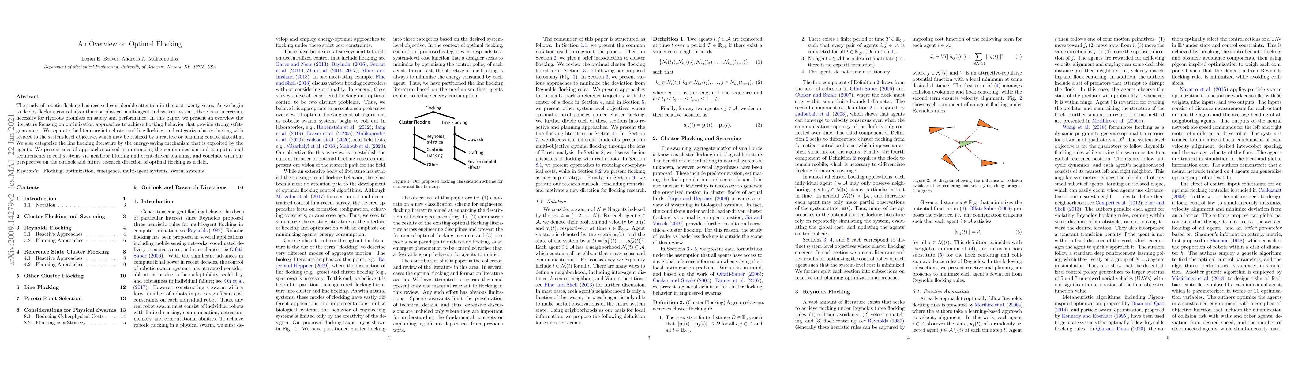 This paper provides an overview of optimization approaches for robotic flocking, emphasizing safety and performance. It categorizes the literature into cluster and line flocking, discussing system-level objectives and energy-saving mechanisms, and highlights methods to reduce communication and computational demands. The paper concludes with future research directions in optimal flocking.