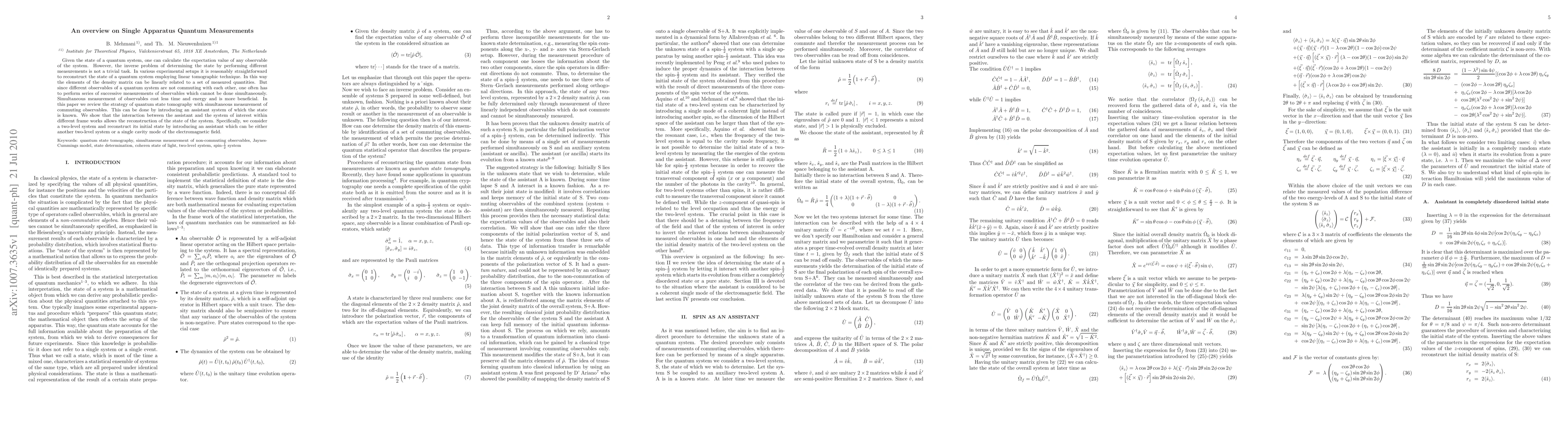 Given the state of a quantum system, one can calculate the expectation value of any observable of the system. However, the inverse problem of determining the state by performing different measurements is not a trivial task. In various experimental setups it is reasonably straightforward to reconstruct the state of a quantum system employing linear tomographic technique. In this way the elements of the density matrix can be linearly related to a set of measured quantities. But since different observables of a quantum system are not commuting with each other, one often has to perform series of successive measurements of observables which cannot be done simultaneously. Simultaneous measurement of observables cost less time and energy and is more beneficial. In this paper we review the strategy of quantum state tomography with simultaneous measurement of commuting observables. This can be done by introducing an assistant system of which the state is known. We show that the interaction between the assistant and the system of interest within different frame works allows the reconstruction of the state of the system. Specifically, we consider a two-level system and reconstruct its initial state by introducing an assistant which can be either another two-level system or a single cavity mode of the electromagnetic field.