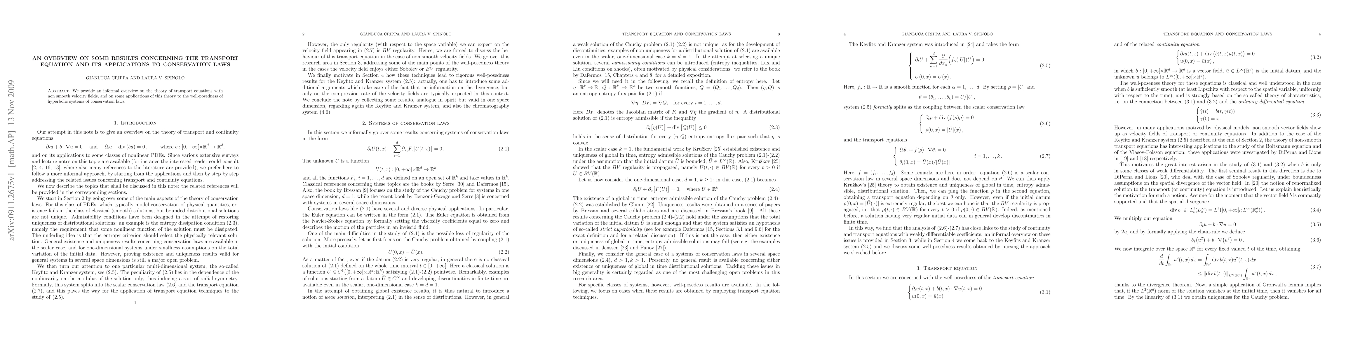 The paper discusses the transport equation with non-smooth velocity fields and its applications to hyperbolic systems of conservation laws, focusing on well-posedness and key results.