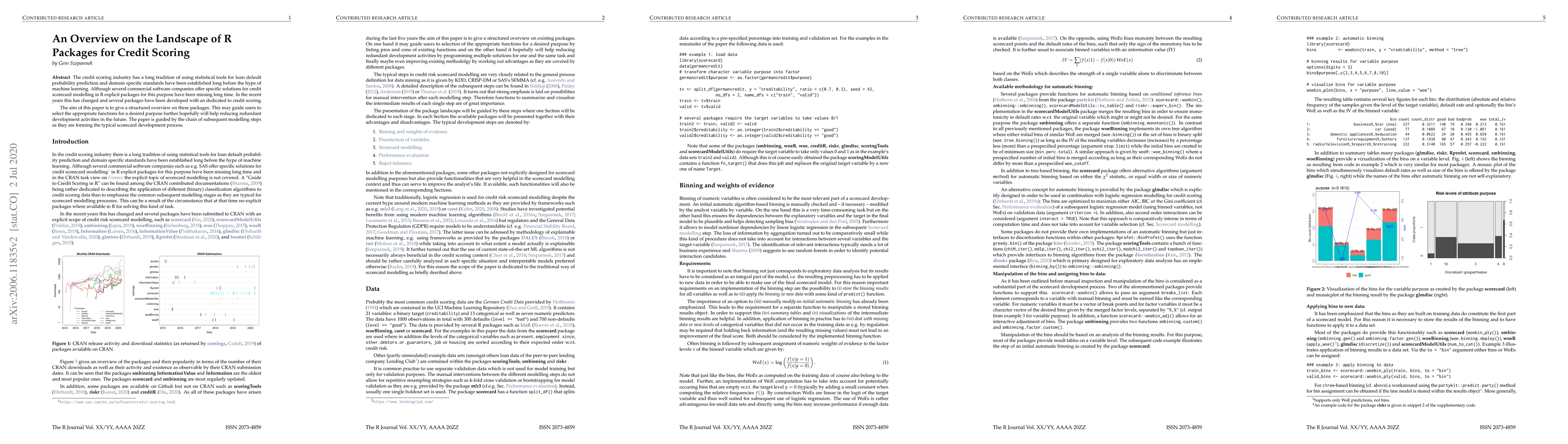 This paper provides a structured overview of R packages dedicated to credit scoring, highlighting the evolution from traditional statistical tools to modern machine learning approaches. It outlines the typical scorecard development process and aims to guide users in selecting appropriate functions for their needs, while also suggesting directions for future development.