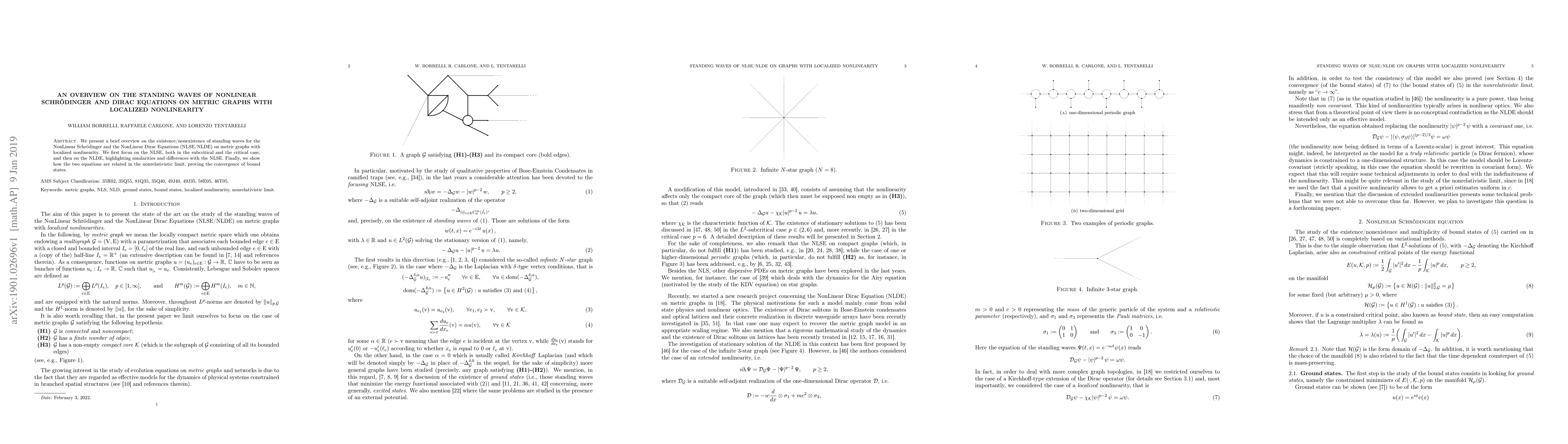 We present a brief overview on the existence/nonexistence of standing waves for the NonLinear Schr\"odinger and the NonLinear Dirac Equations (NLSE/NLDE) on metric graphs with localized nonlinearity. We first focus on the NLSE, both in the subcritical and the critical case, and then on the NLDE, highlighting similarities and differences with the NLSE. Finally, we show how the two equations are related in the nonrelativistic limit, proving the convergence of bound states.