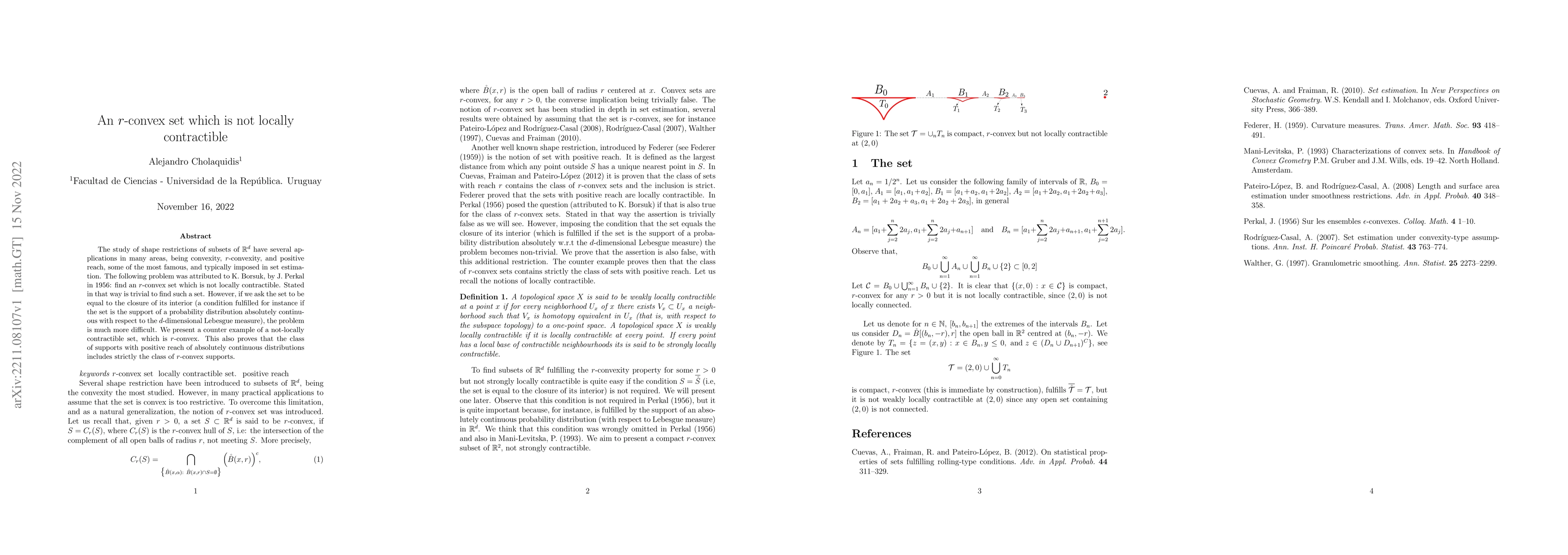 The study of shape restrictions of subsets of $\mathbb{R}^d$ have several applications in many areas, being convexity, $r$-convexity, and positive reach, some of the most famous, and typically imposed in set estimation. The following problem was attributed to K. Borsuk, by J. Perkal in 1956: find an $r$-convex set which is not locally contractible. Stated in that way is trivial to find such a set. However, if we ask the set to be equal to the closure of its interior (a condition fulfilled for instance if the set is the support of a probability distribution absolutely continuous with respect to the $d$-dimensional Lebesgue measure), the problem is much more difficult. We present a counter example of a not-locally contractible set, which is $r$-convex. This also proves that the class of supports with positive reach of absolutely continuous distributions includes strictly the class of $r$-convex supports.