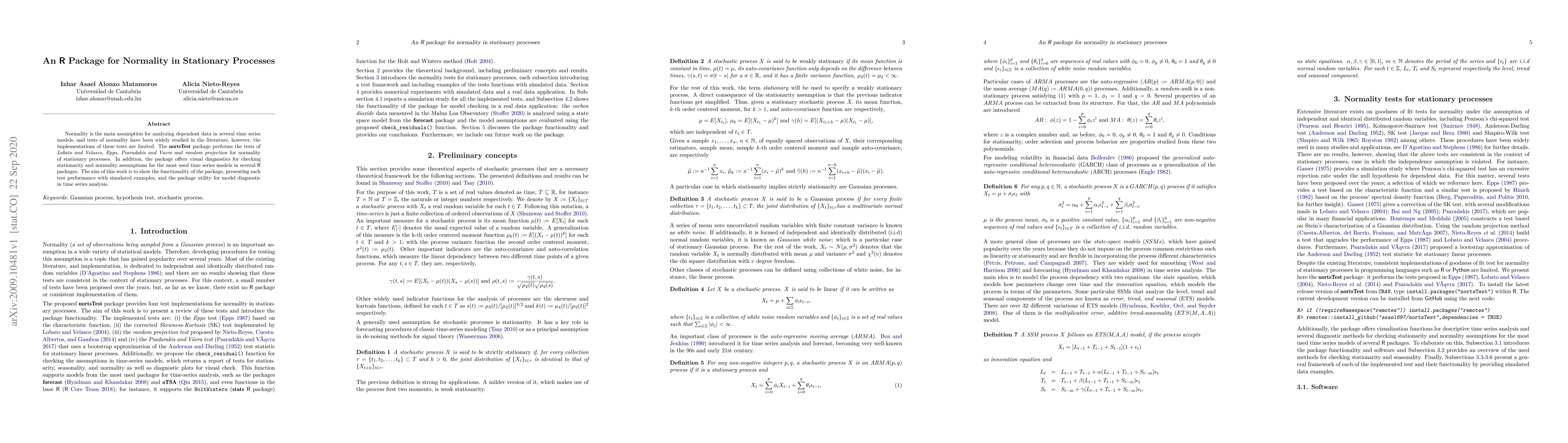 Normality is the main assumption for analyzing dependent data in several time series models, and tests of normality have been widely studied in the literature, however, the implementations of these tests are limited. The \textbf{nortsTest} package performs the tests of \textit{Lobato and Velasco, Epps, Psaradakis and Vavra} and \textit{random projection} for normality of stationary processes. In addition, the package offers visual diagnostics for checking stationarity and normality assumptions for the most used time series models in several \R packages. The aim of this work is to show the functionality of the package, presenting each test performance with simulated examples, and the package utility for model diagnostic in time series analysis.