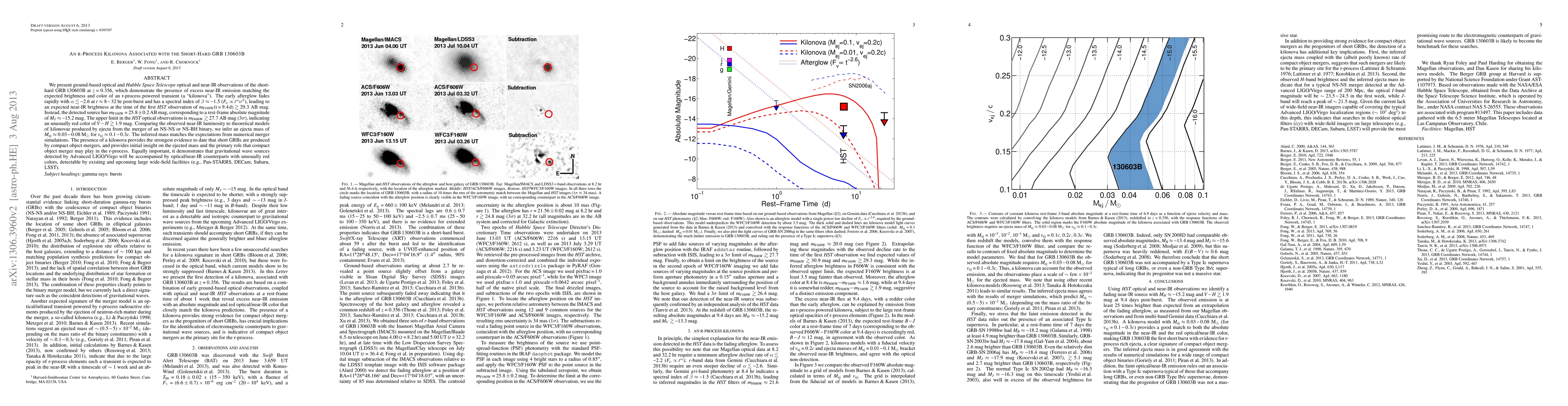A ground-based optical and Hubble Space Telescope observation reveals a kilonova associated with short-hard GRB 130603B, providing evidence of compact object mergers in the production of short GRBs and offering insight into the ejected mass and role of merger events.
