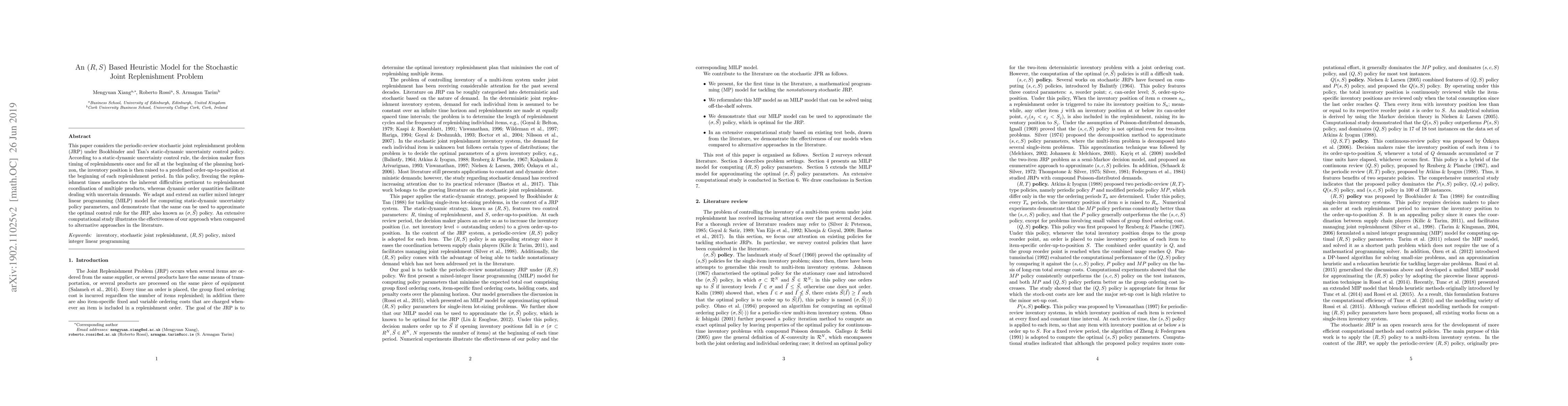 This paper proposes an (R, S) heuristic model to address the stochastic joint replenishment problem under a static-dynamic uncertainty control policy, demonstrating its effectiveness through computational comparisons with existing methods. The model adapts a mixed integer linear programming (MILP) approach to approximate the optimal control rule.
