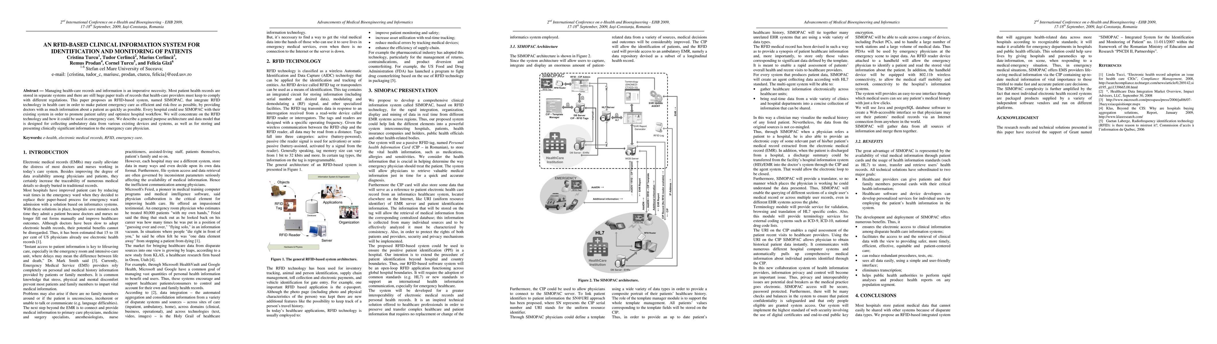 Managing health-care records and information is an imperative necessity. Most patient health records are stored in separate systems and there are still huge paper trails of records that health-care providers must keep to comply with different regulations. This paper proposes an RFID-based system, named SIMOPAC, that integrate RFID technology in health care in order to make patient emergency care as efficient and risk-free as possible, by providing doctors with as much information about a patient as quickly as possible. Every hospital could use SIMOPAC with their existing system in order to promote patient safety and optimize hospital workflow. We will concentrate on the RFID technology and how it could be used in emergency care. We describe a general purpose architecture and data model that is designed for collecting ambulatory data from various existing devices and systems, as well as for storing and presenting clinically significant information to the emergency care physician.