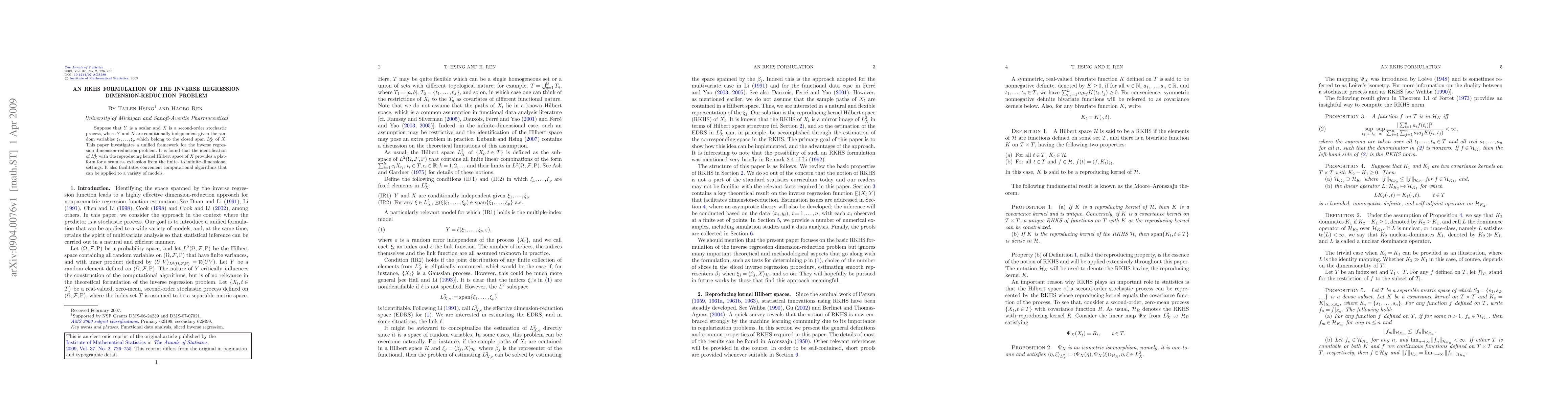 Suppose that $Y$ is a scalar and $X$ is a second-order stochastic process, where $Y$ and $X$ are conditionally independent given the random variables $\xi_1,...,\xi_p$ which belong to the closed span $L_X^2$ of $X$. This paper investigates a unified framework for the inverse regression dimension-reduction problem. It is found that the identification of $L_X^2$ with the reproducing kernel Hilbert space of $X$ provides a platform for a seamless extension from the finite- to infinite-dimensional settings. It also facilitates convenient computational algorithms that can be applied to a variety of models.