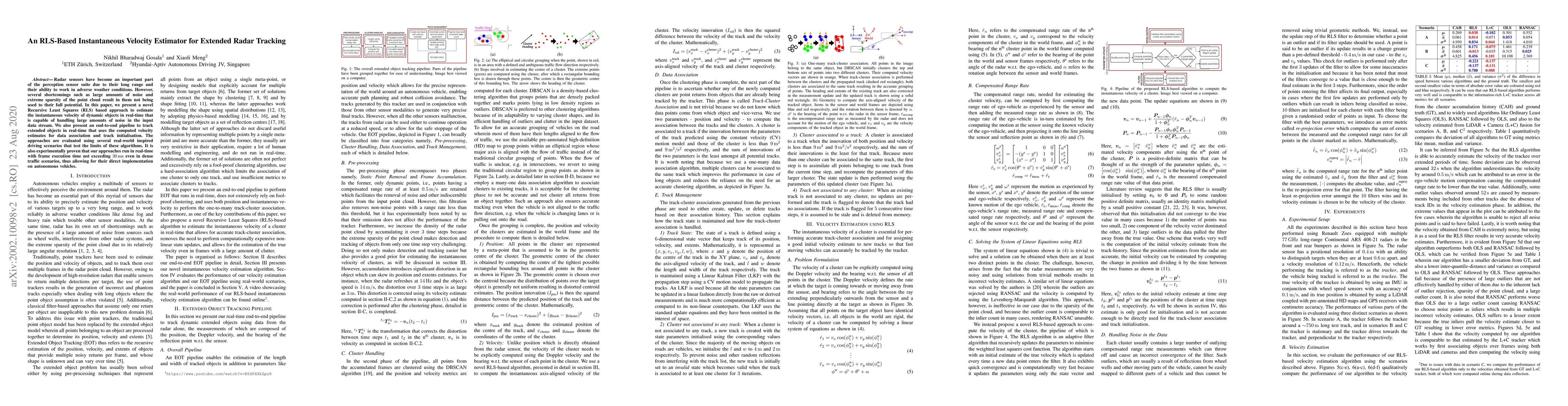 Radar sensors have become an important part of the perception sensor suite due to their long range and their ability to work in adverse weather conditions. However, several shortcomings such as large amounts of noise and extreme sparsity of the point cloud result in them not being used to their full potential. In this paper, we present a novel Recursive Least Squares (RLS) based approach to estimate the instantaneous velocity of dynamic objects in real-time that is capable of handling large amounts of noise in the input data stream. We also present an end-to-end pipeline to track extended objects in real-time that uses the computed velocity estimates for data association and track initialisation. The approaches are evaluated using several real-world inspired driving scenarios that test the limits of these algorithms. It is also experimentally proven that our approaches run in real-time with frame execution time not exceeding 30 ms even in dense traffic scenarios, thus allowing for their direct implementation on autonomous vehicles.