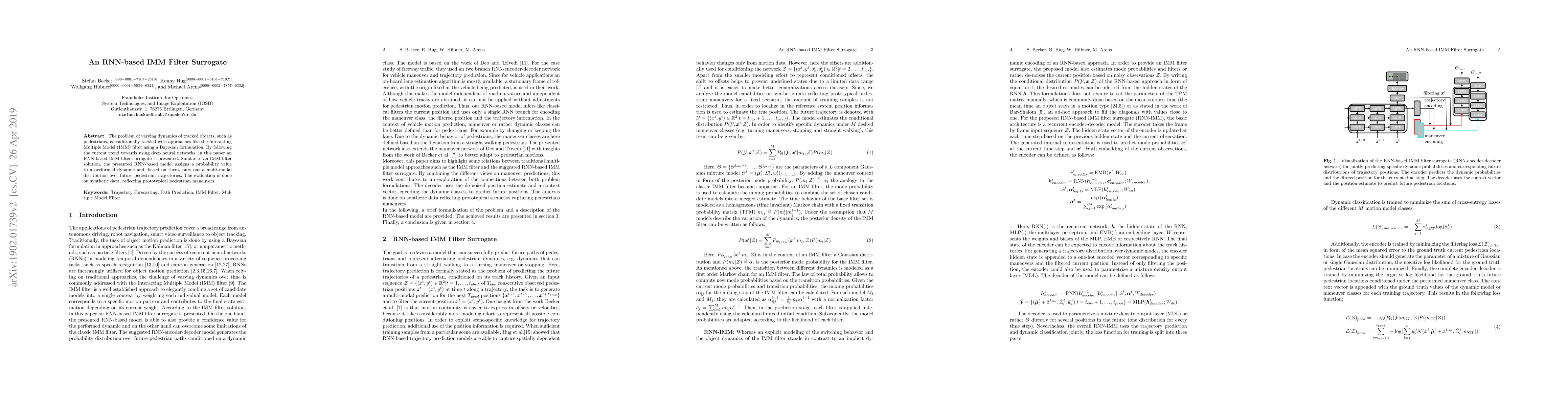 This paper proposes an RNN-based surrogate for the Interacting Multiple Model (IMM) filter to handle varying dynamics of tracked objects like pedestrians. The model assigns probabilities to dynamic behaviors and outputs a multi-modal distribution for future trajectories, evaluated on synthetic pedestrian data.