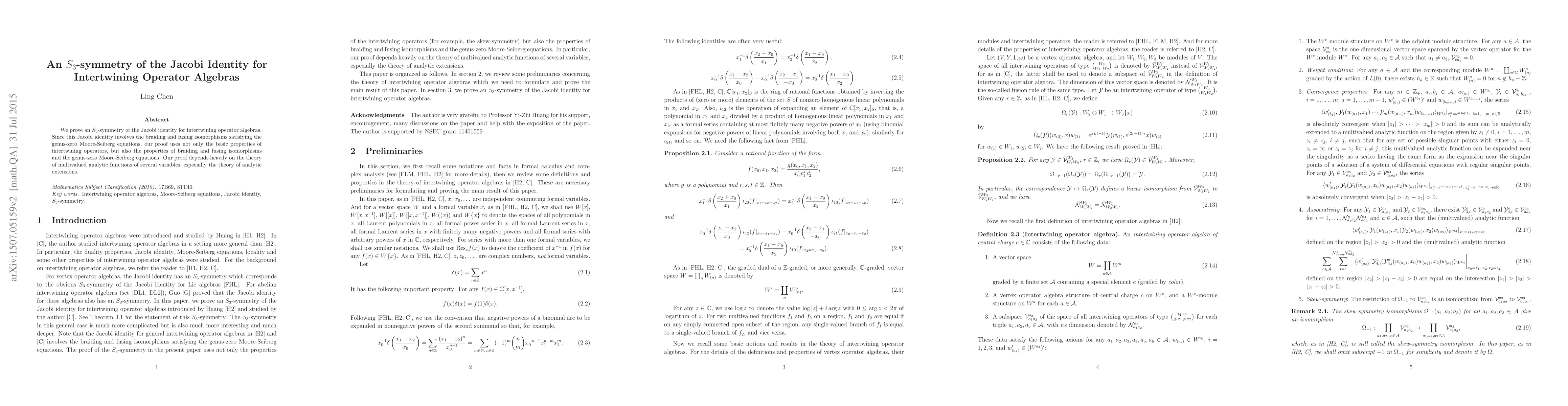 We prove an $S_{3}$-symmetry of the Jacobi identity for intertwining operator algebras. Since this Jacobi identity involves the braiding and fusing isomorphisms satisfying the genus-zero Moore-Seiberg equations, our proof uses not only the basic properties of intertwining operators, but also the properties of braiding and fusing isomorphisms and the genus-zero Moore-Seiberg equations. Our proof depends heavily on the theory of multivalued analytic functions of several variables, especially the theory of analytic extensions.