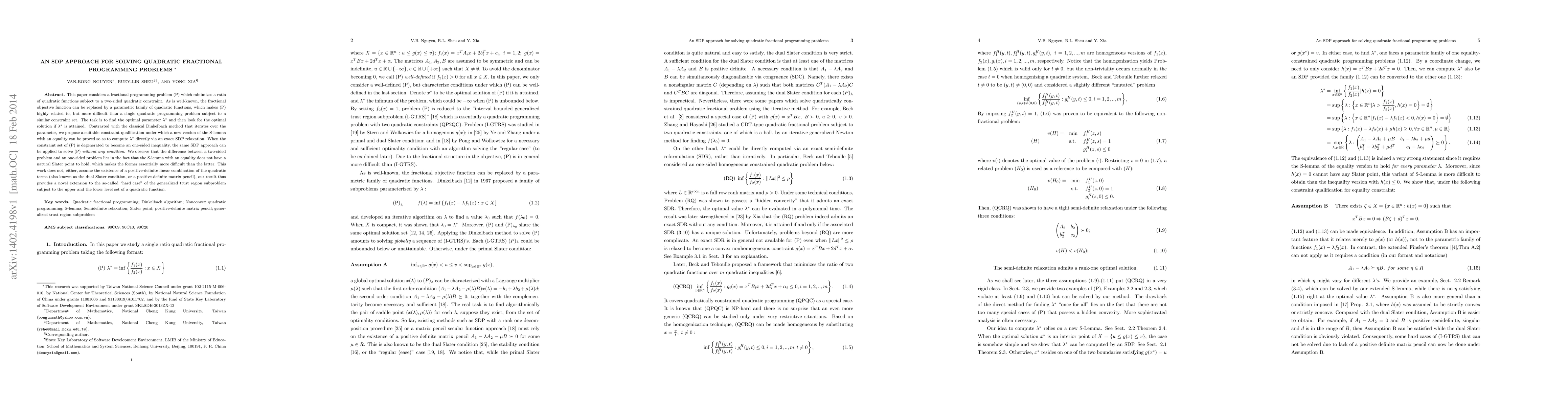 This paper proposes an SDP approach to solve quadratic fractional programming problems by directly computing the optimal parameter via an exact SDP relaxation, contrasting with the iterative Dinkelbach method. It extends the method to one-sided problems without requiring a positive-definite matrix pencil, addressing the "hard case" of generalized trust region subproblems.