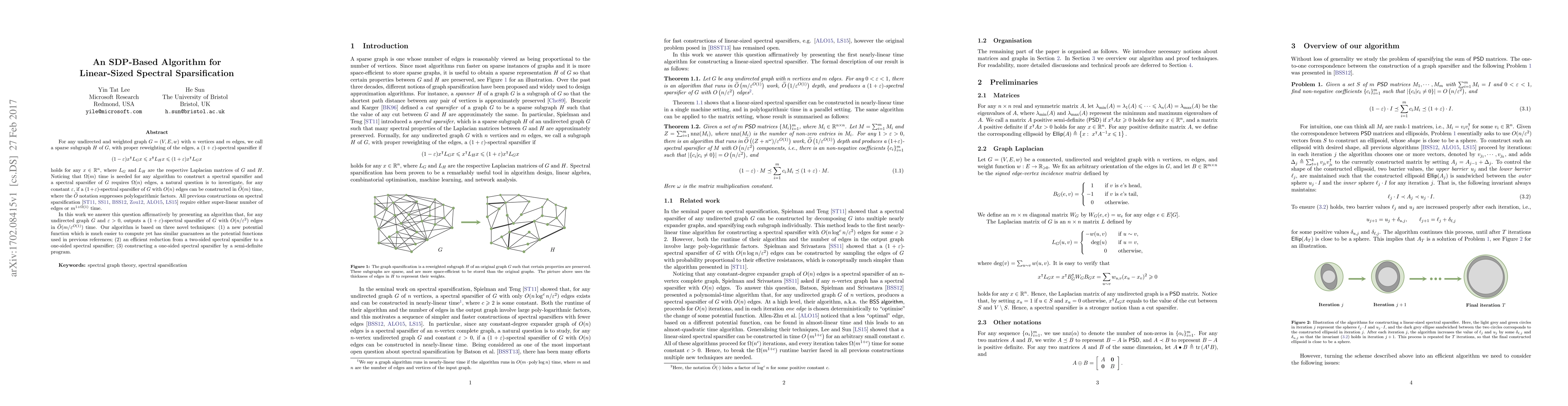 This paper presents an algorithm for constructing a linear-sized spectral sparsifier of an undirected graph in nearly linear time, achieving a $(1+\varepsilon)$-spectral sparsifier with $O(n/\varepsilon^2)$ edges in $\tilde{O}(m/\varepsilon^{O(1)})$ time, using novel techniques including a new potential function and efficient reductions.
